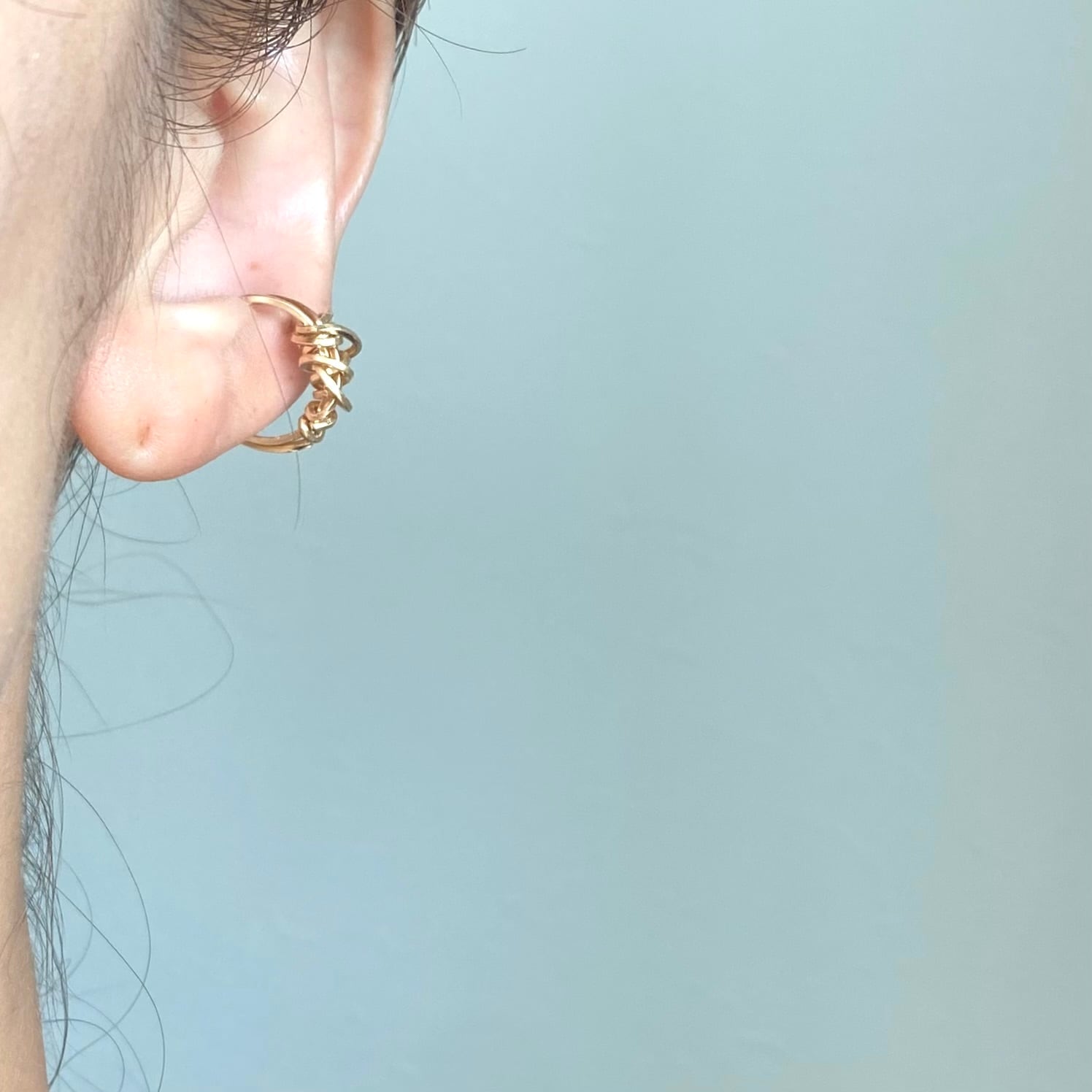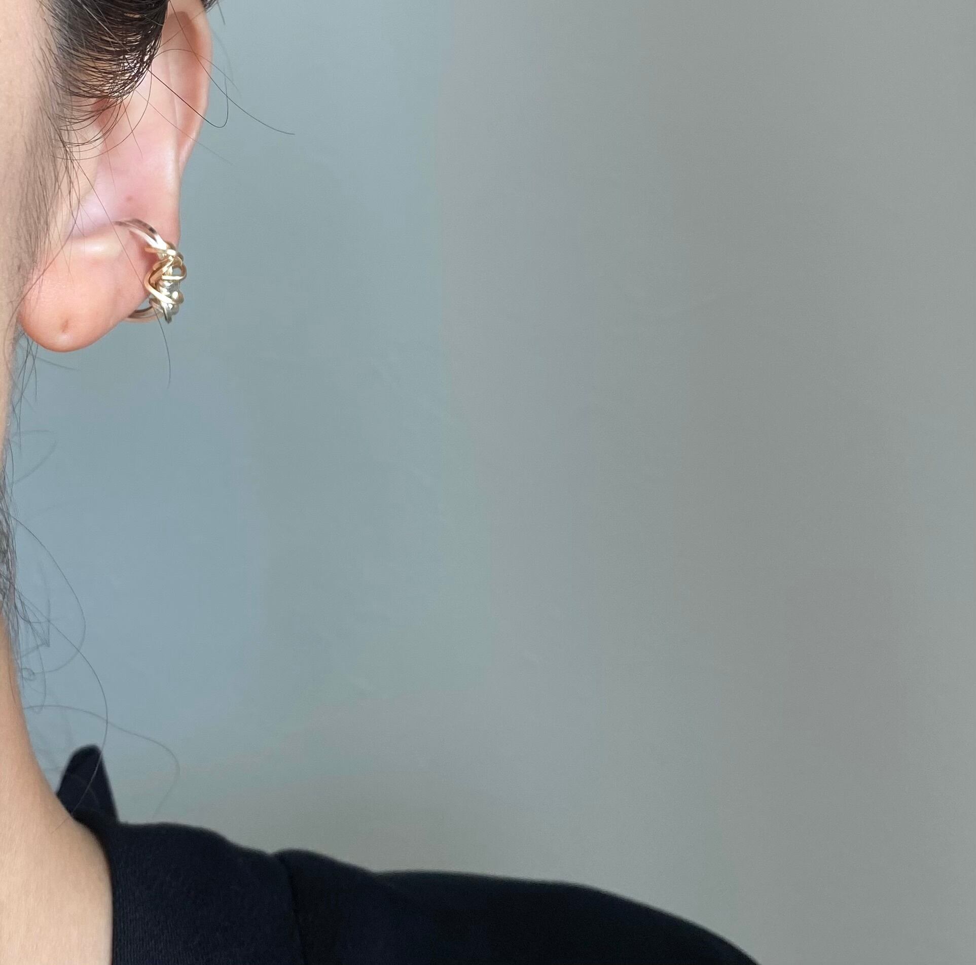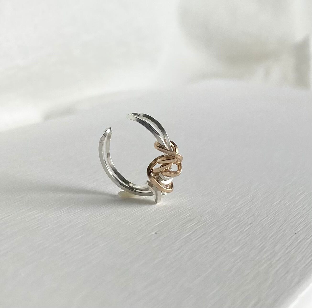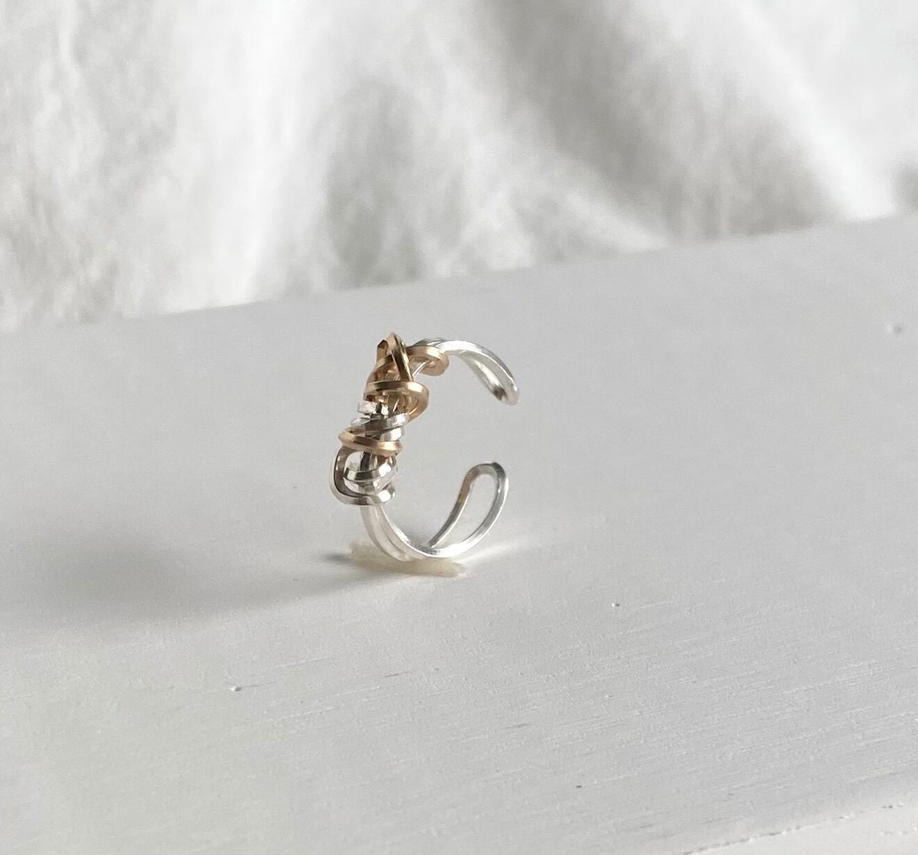 ゴールドとシルバーのラインがクシャっとラフに巻かれたモチーフが印象的なイヤーカフ。