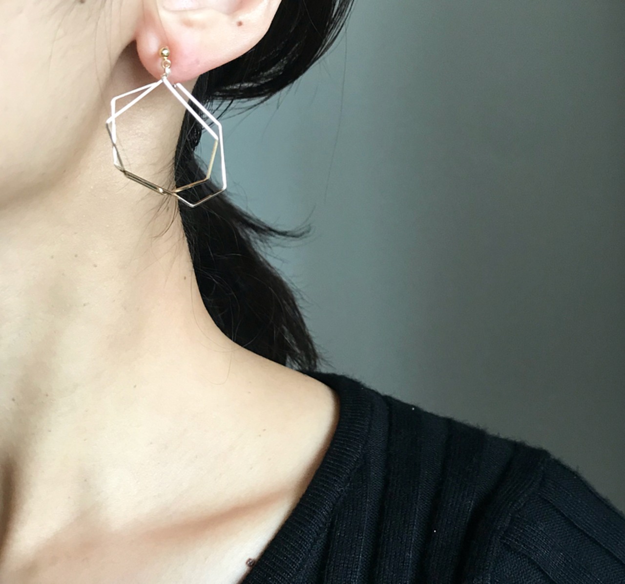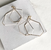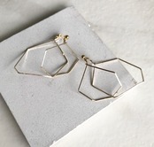 大きさの異なる華奢な多角形のフープのラインが耳たぶを挟むように重なる立体的なピアスです。