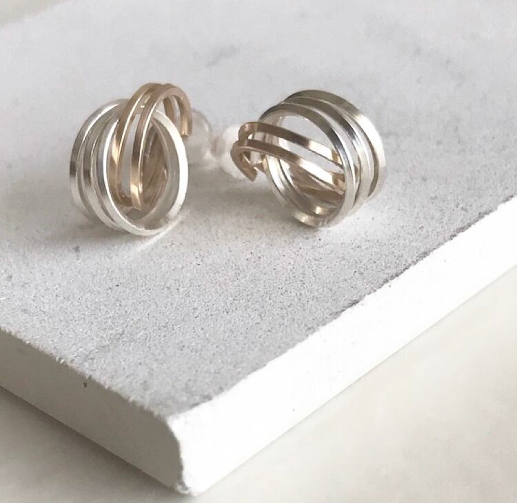 ゴールドとシルバーの5つのフープが交差し重なったように見える、立体感が美しいスタッドピアス です。