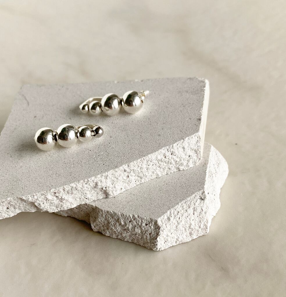 サイズの異なる14kgfのメタリックボールが耳たぶの上で横並びに連なるアクセサリー。3mm、4mm、6mmの3種を使用。