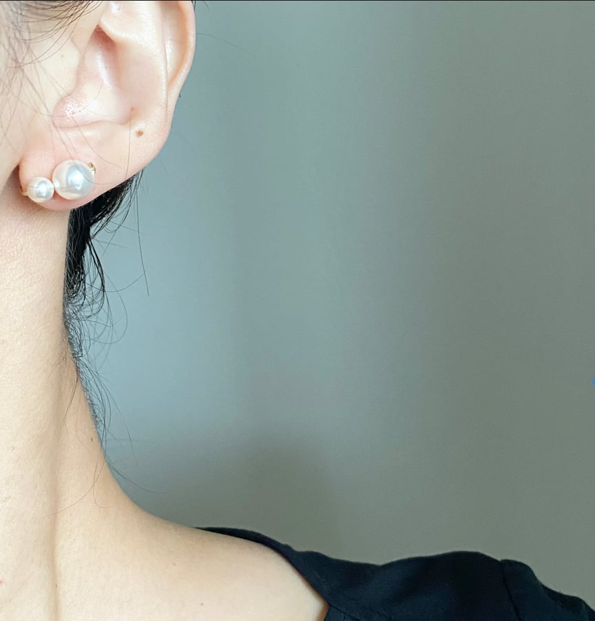 写真1枚目のように横向きに耳たぶを挟むようにお召し頂いたり、写真2枚目ように縦にパールが並ぶように耳たぶに挟んでお召し頂いたり、写真3枚目のようにフックピアスのようにお召しいただいたり。