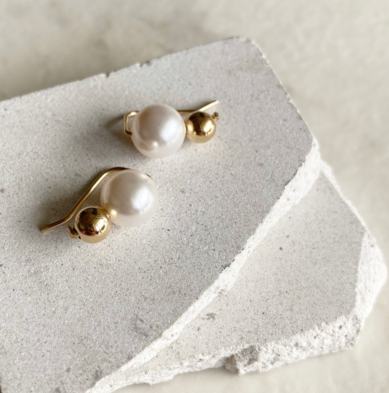 8ミリのパールと6ミリのゴールドのメタルボールが隣り合って並んだ耳たぶを挟むタイプのイヤーカフ 。