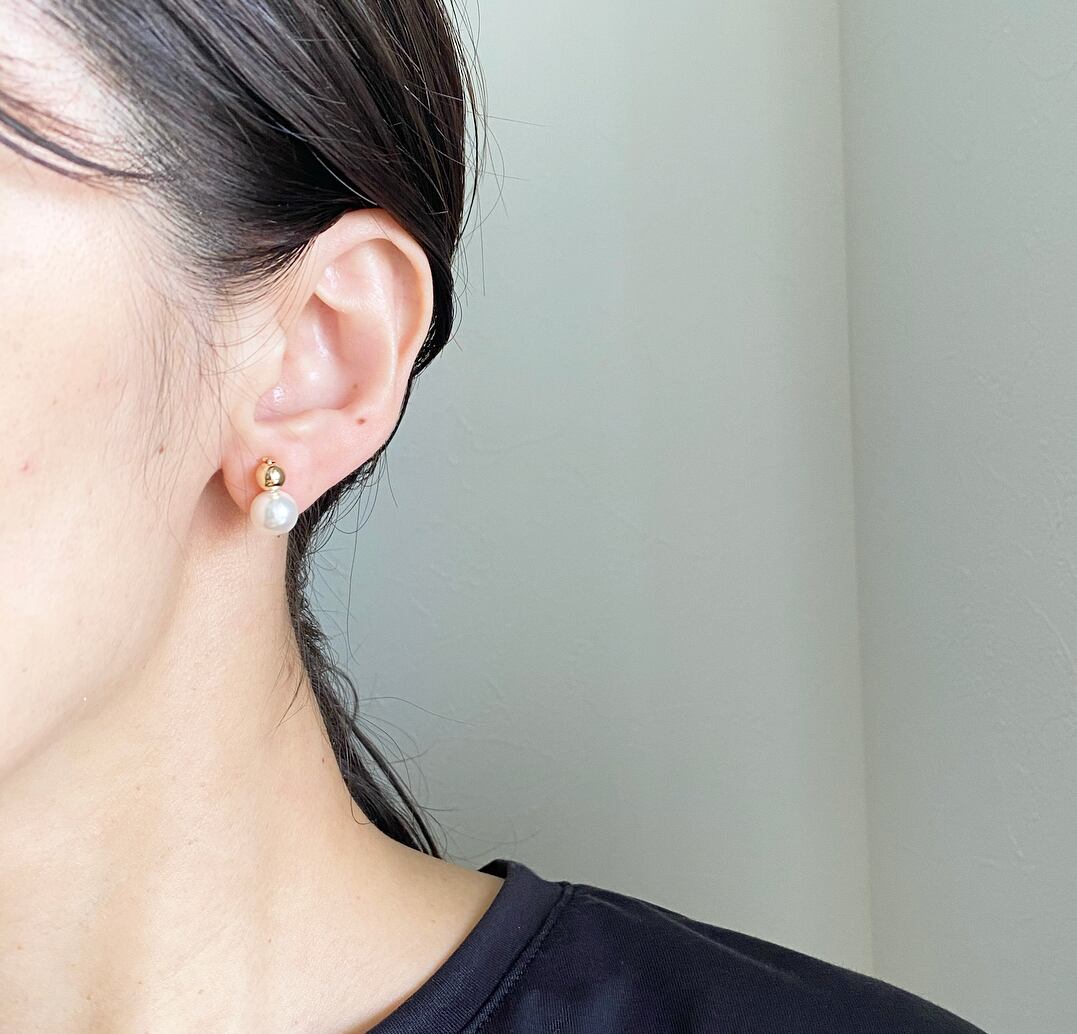 本真珠にも負けない照りでありながらつけ心地はとても軽く汗にも強いのが魅力です。こぶりでシンプルでありながらメタルボールと並ぶことで洗練された印象に。