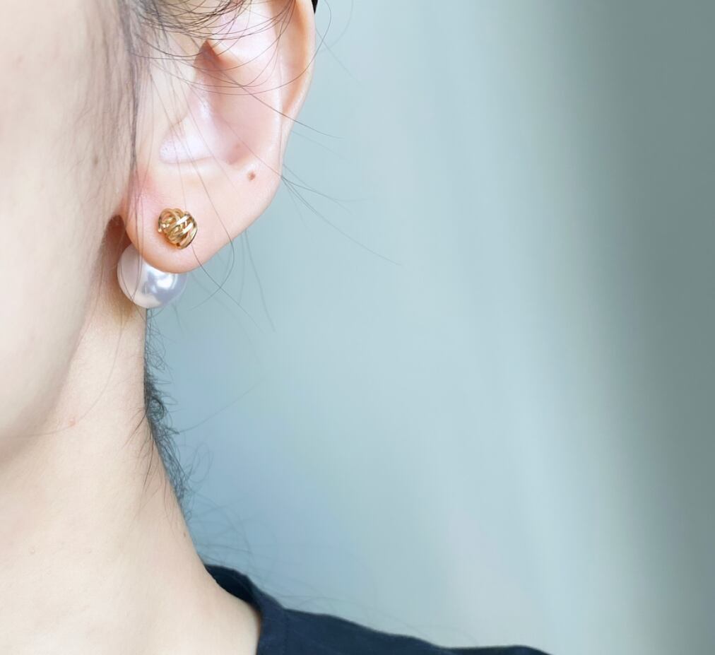 ピアスを耳たぶ後ろから挿していただき、パールが正面にくるようにお召しいただければ大振りのパールピアスとしてもご着用いただけます。