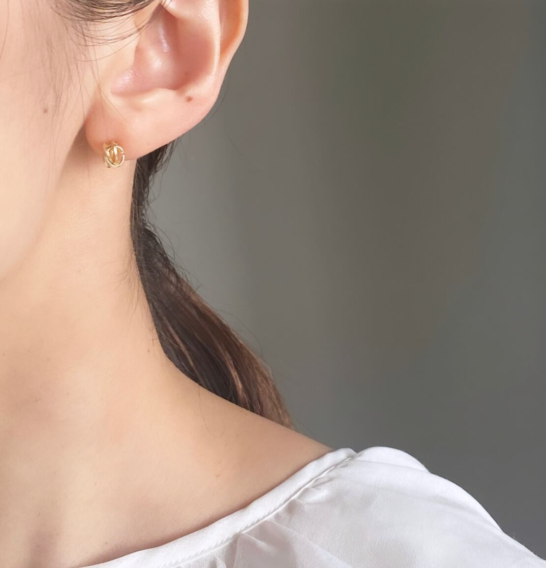 耳たぶに小さなフープふが乗っかっているような横顔になる可愛らしいピアスです。