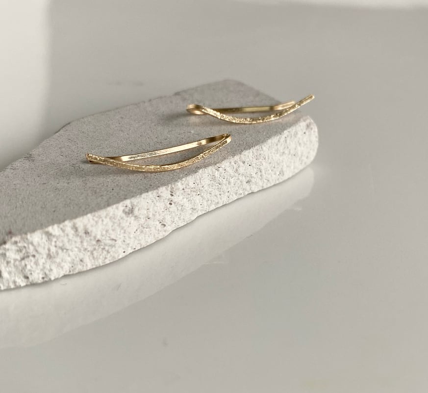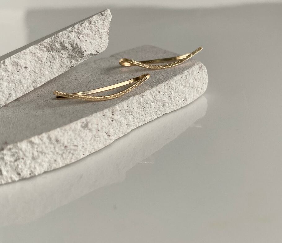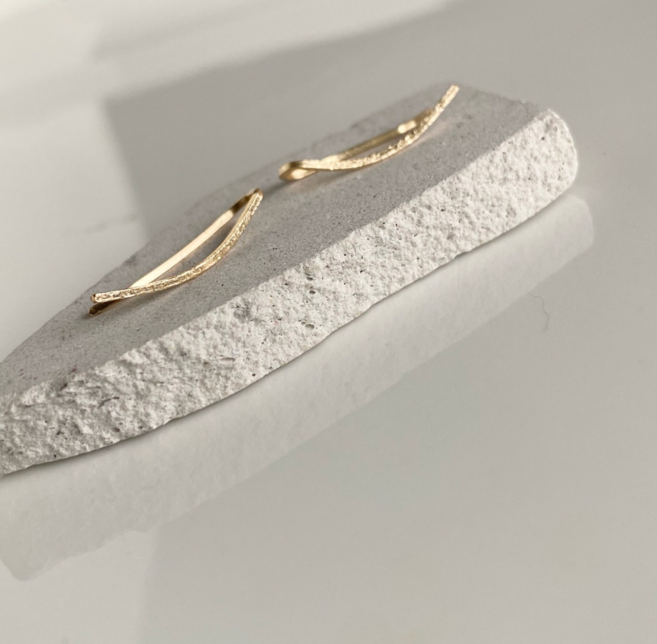 目の細かいテクスチャー加工を施したカーブのラインが耳たぶに沿うように輝くイヤークリップ、ピアス 。
