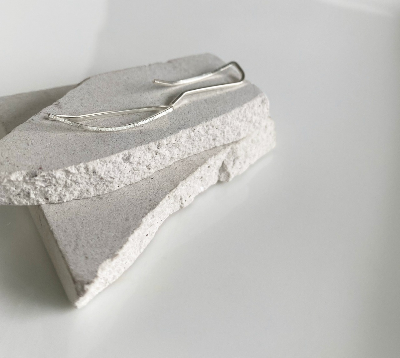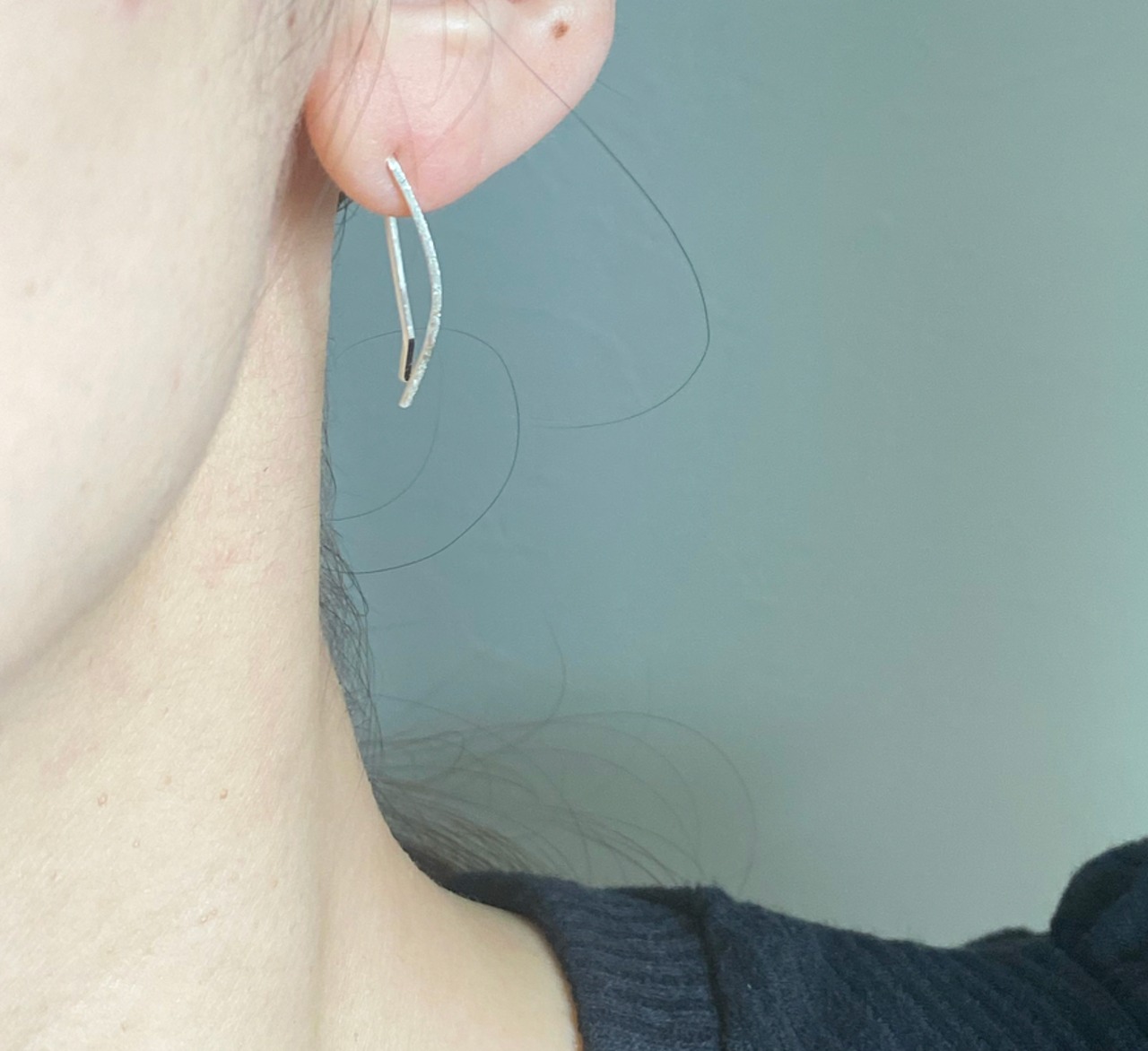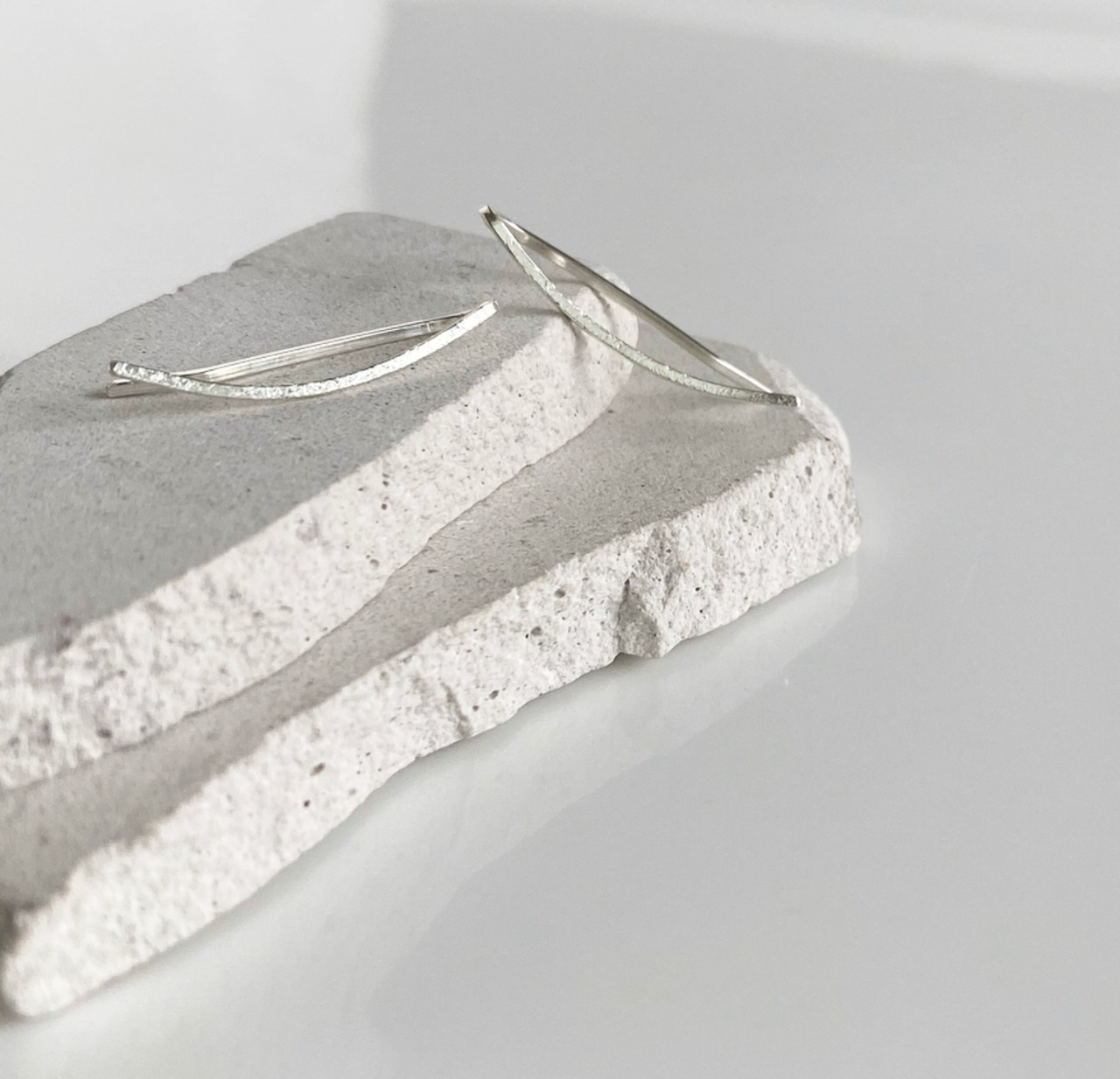 目の細かいテクスチャー加工を施したカーブのラインが耳たぶに沿うように輝くイヤークリップ、ピアス 。