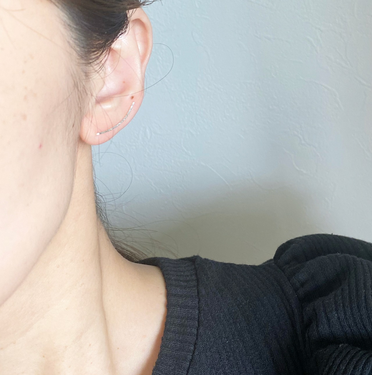 ピアスホールのある方は、ピアスホールに挿してから90度回転させて頂き装着することができ、ピアスホールの無い方は耳たぶを挟んでお召しいただけます。