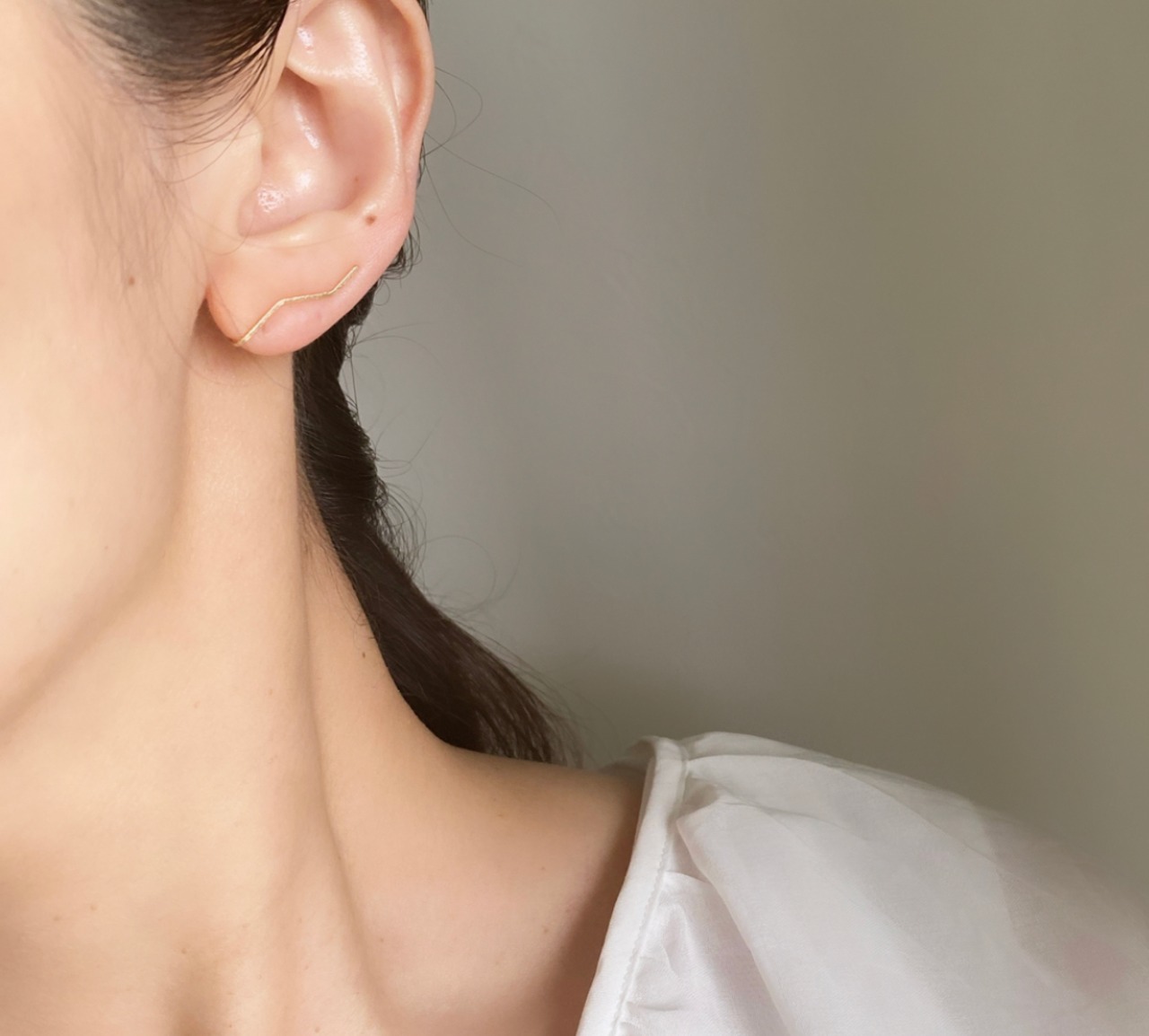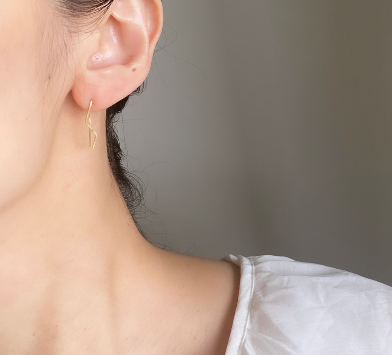 目の細かいテクスチャー加工を施したジグザグのラインが耳たぶに沿うように輝くイヤークリップ、ピアス 。