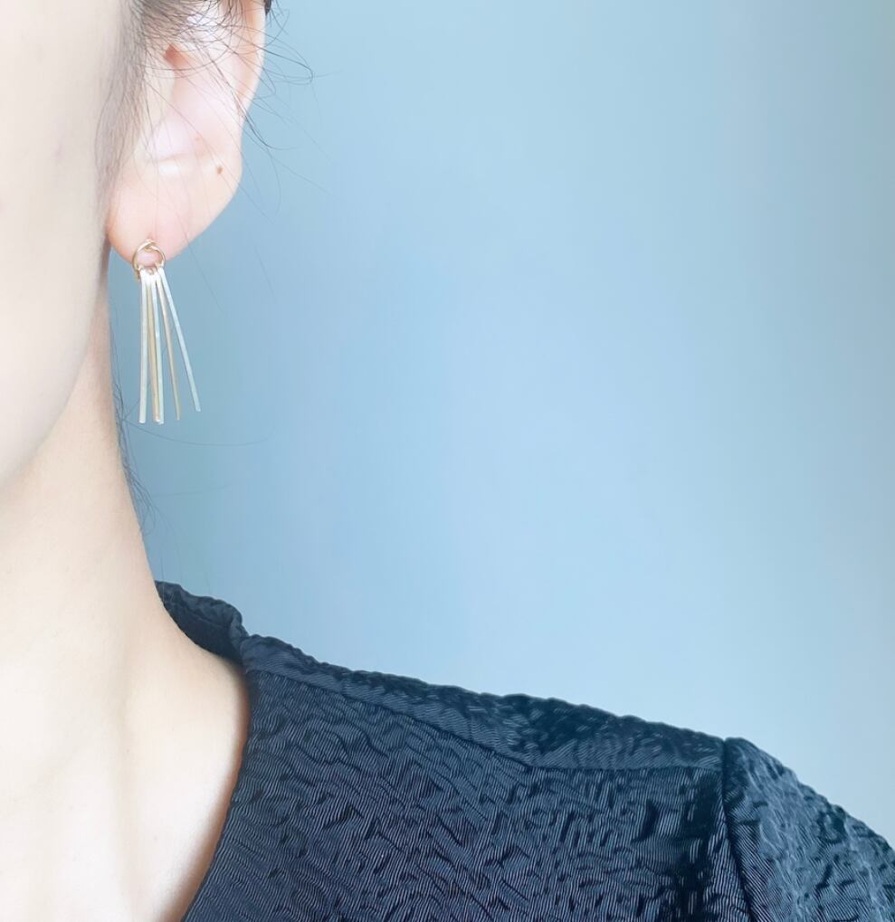 ピアスポストのリング部分はゴールド。フリンジは2本がゴールド。3本がシルバー。ゴールド、シルバーミックスのバイカラーです。