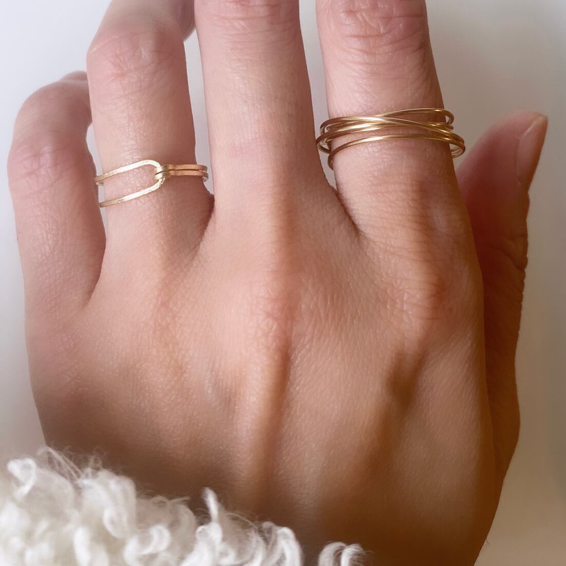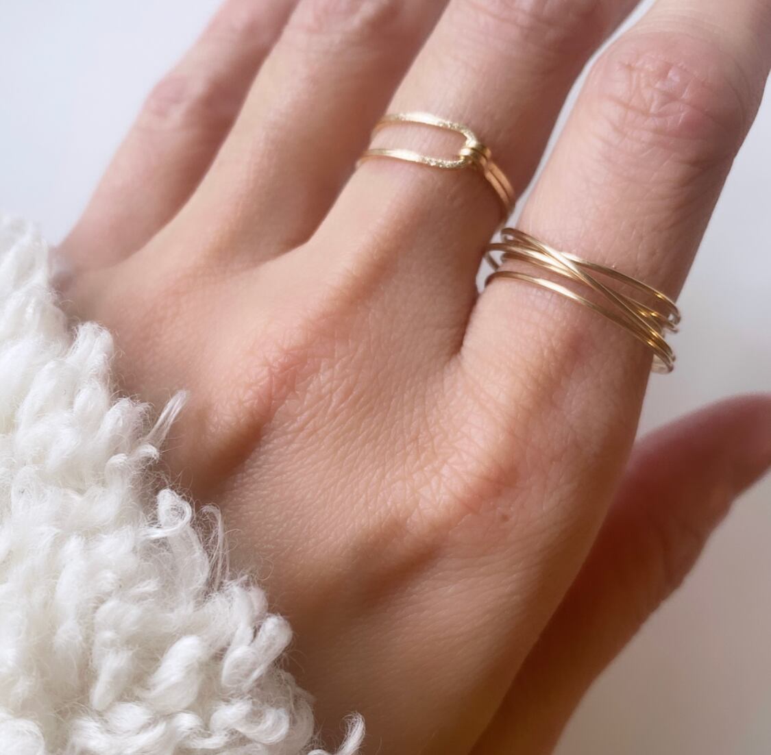 華奢なゴールドのラインの重なりが美しい5連リングと、星くずのような細かテクスチャー加工を施したシンプルながらも目を惹くデザインのリング。単体でご着用いただくのはもちろん、一緒にお召しいただいても相性の良い2点をセットにしました。