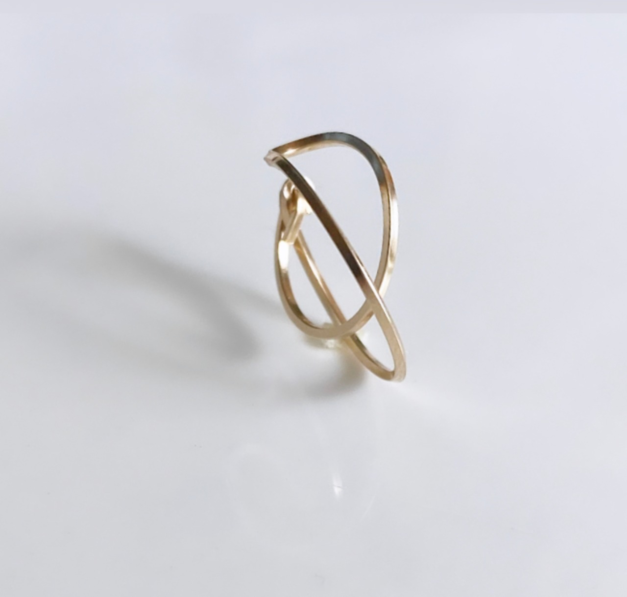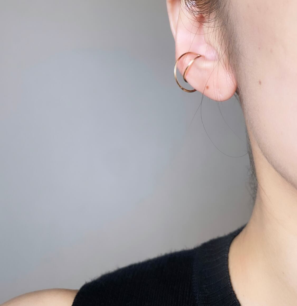 大きさのことなる2つのフープが重なり交差する立体感あるイヤーカフ。