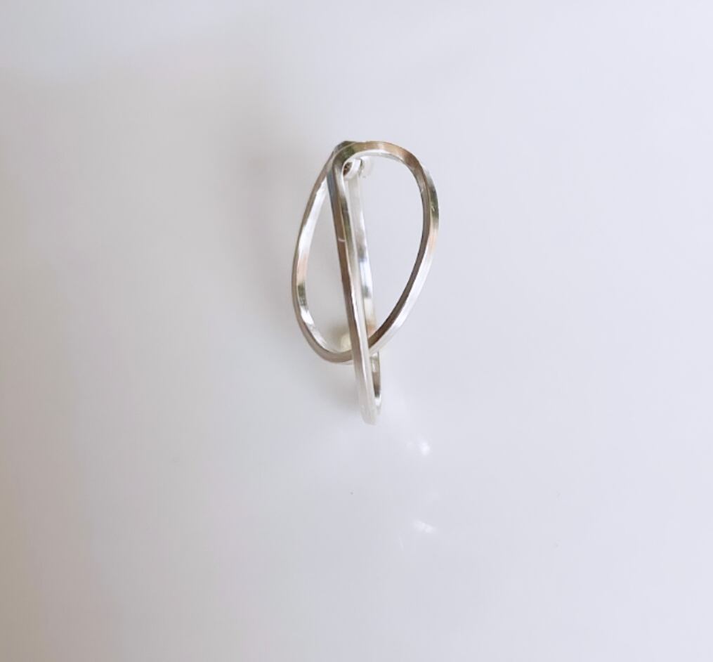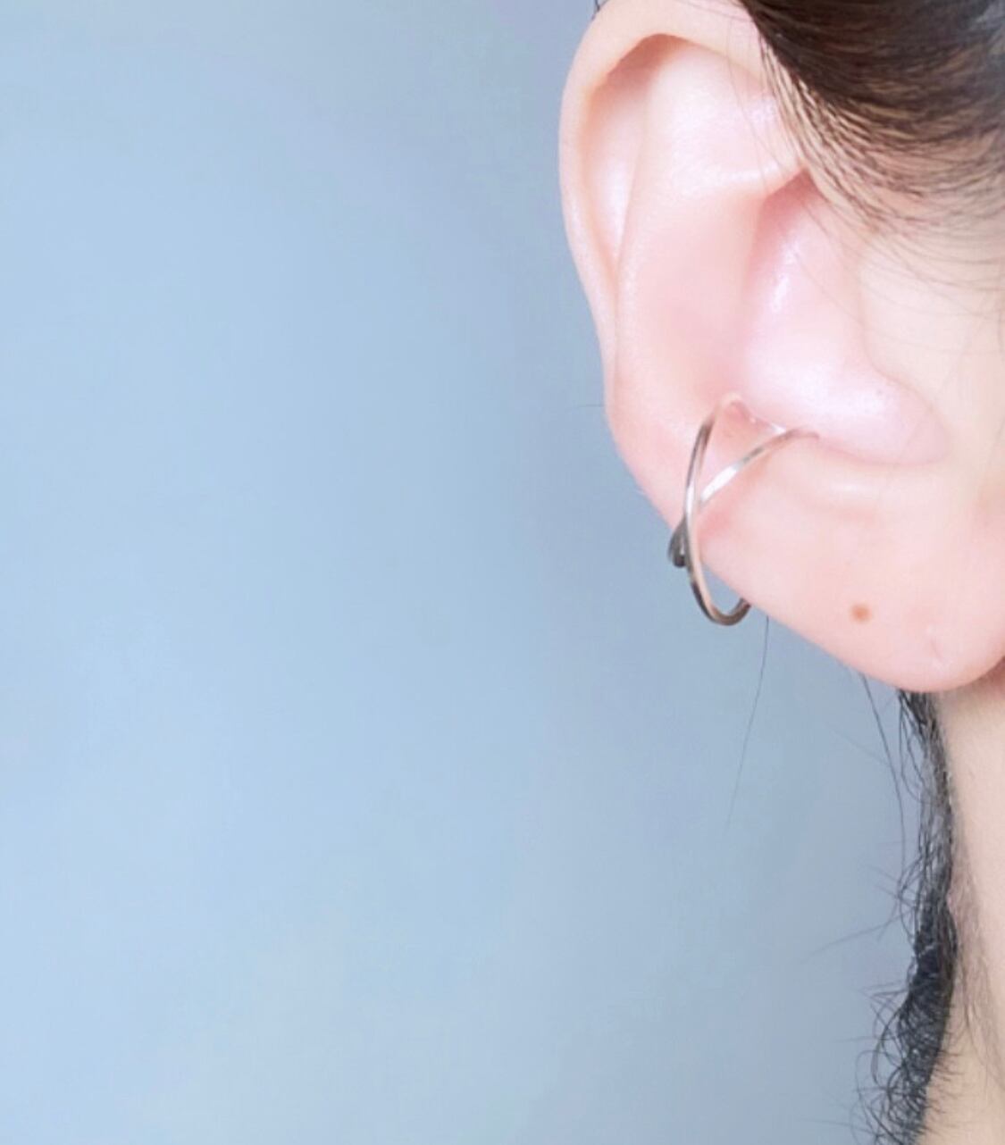 大きさのことなる2つのフープが重なり交差する立体感あるイヤーカフ。