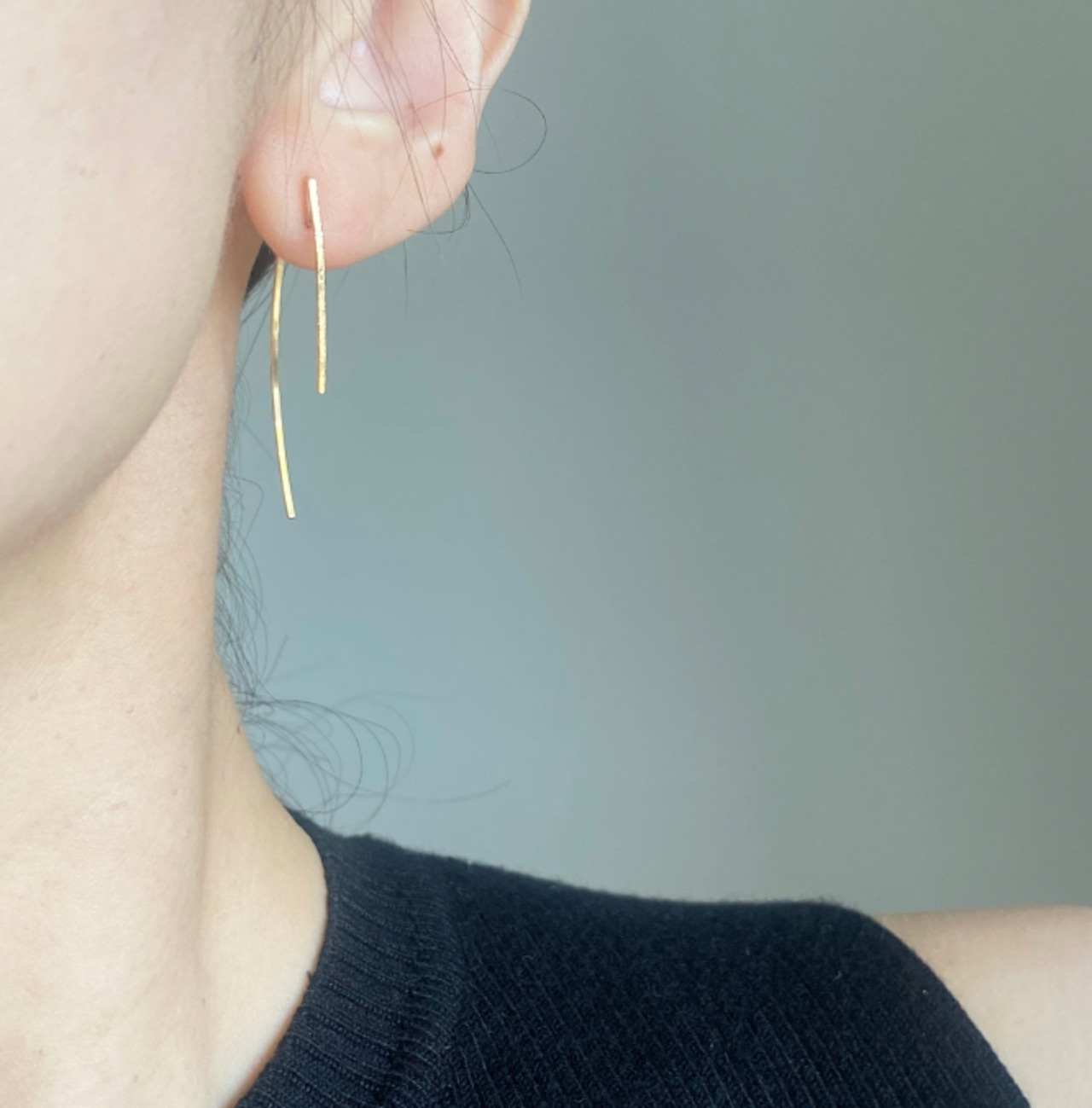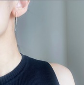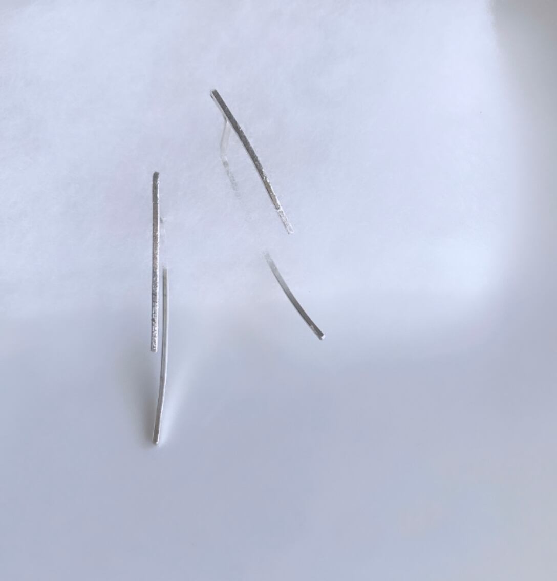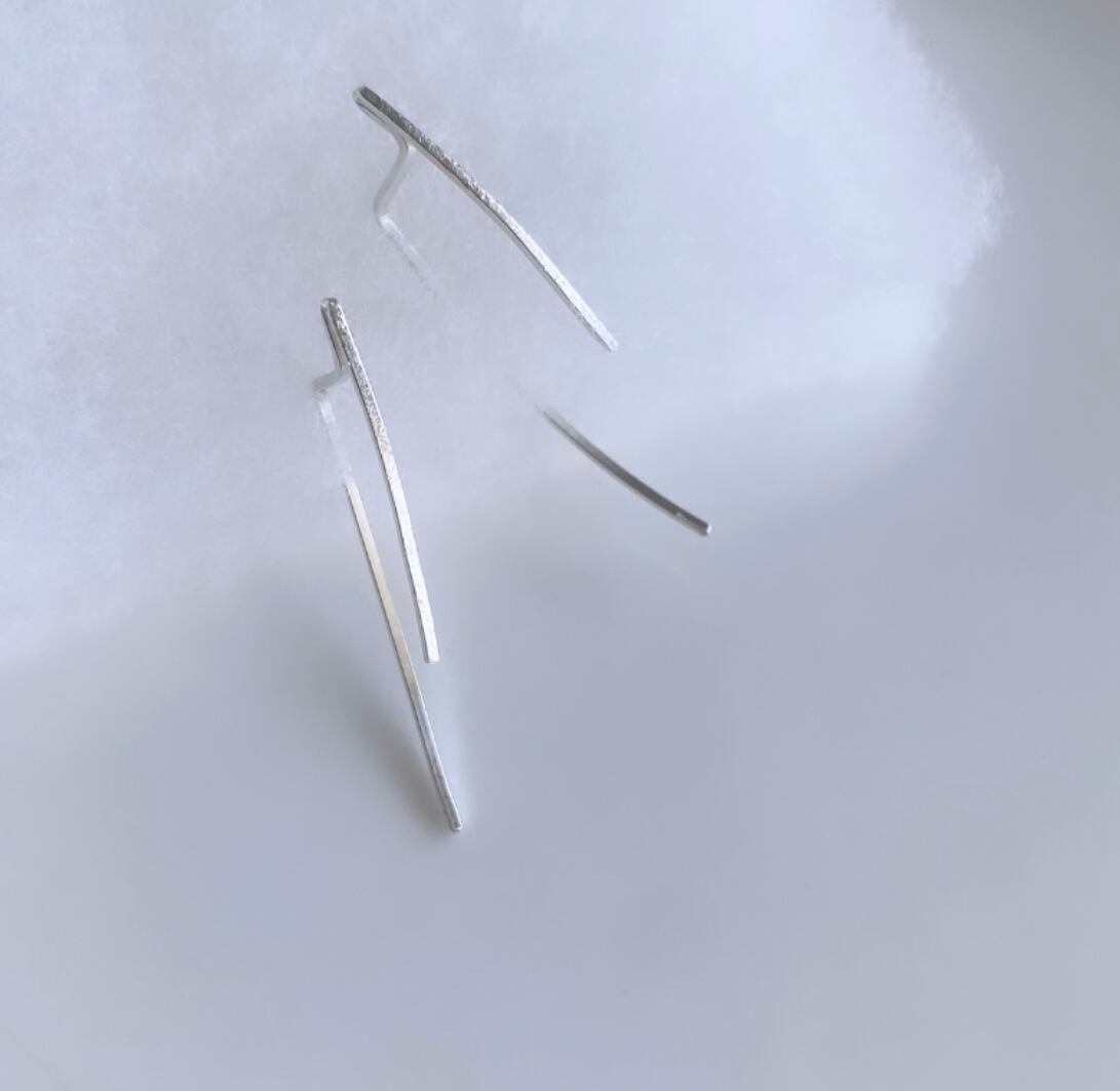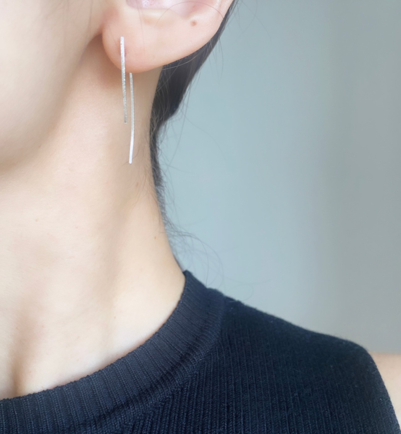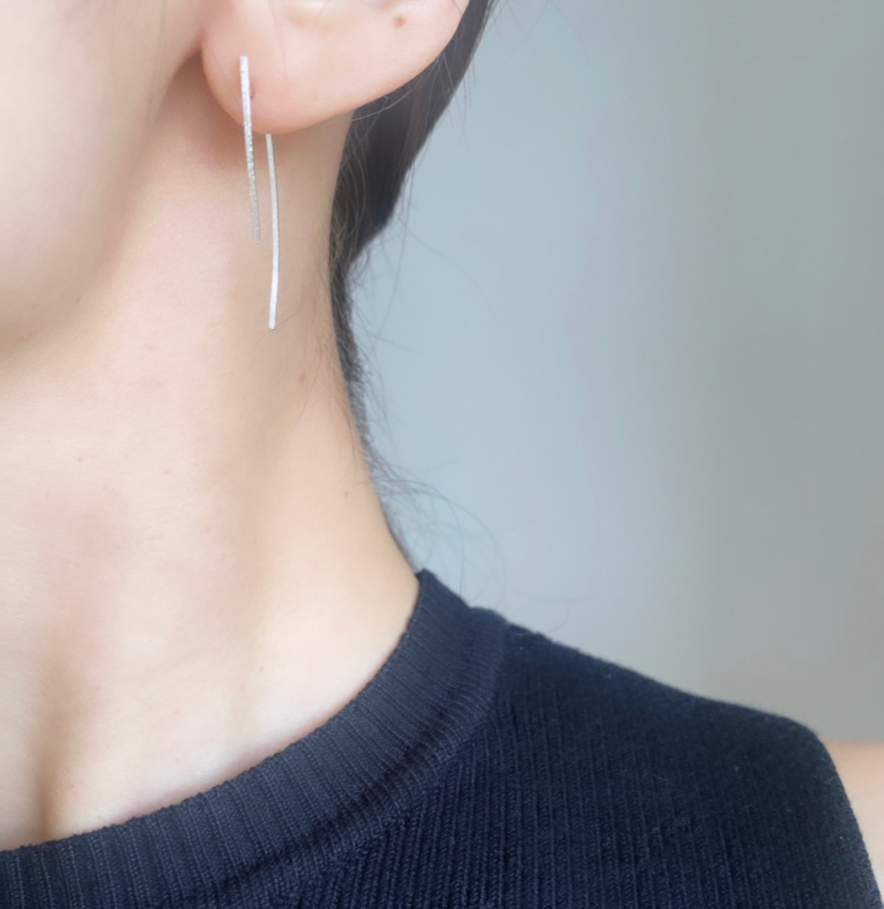 耳たぶの前後に長さの異なるシルバーのラインが流れるようにきらめくピアス。