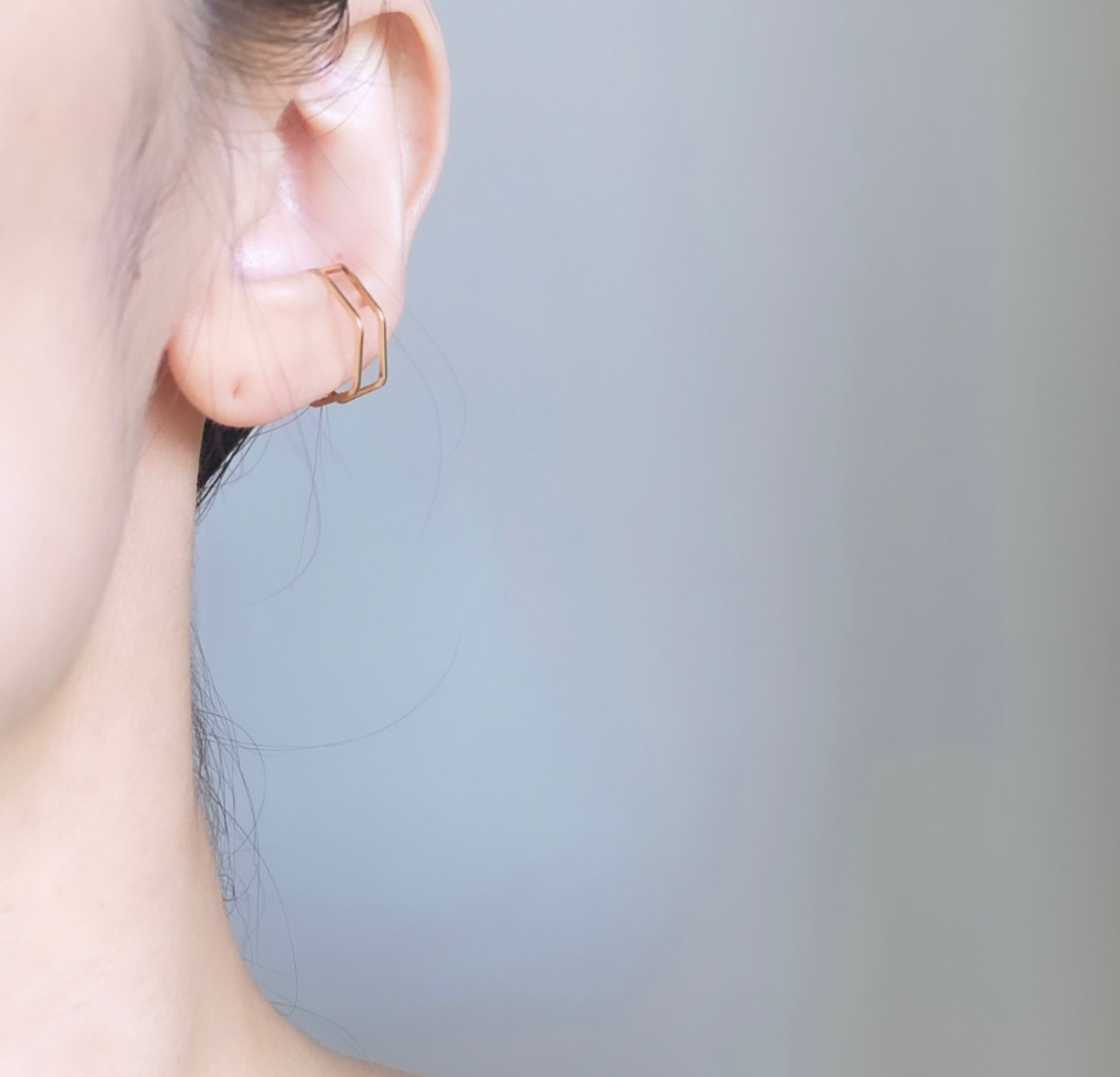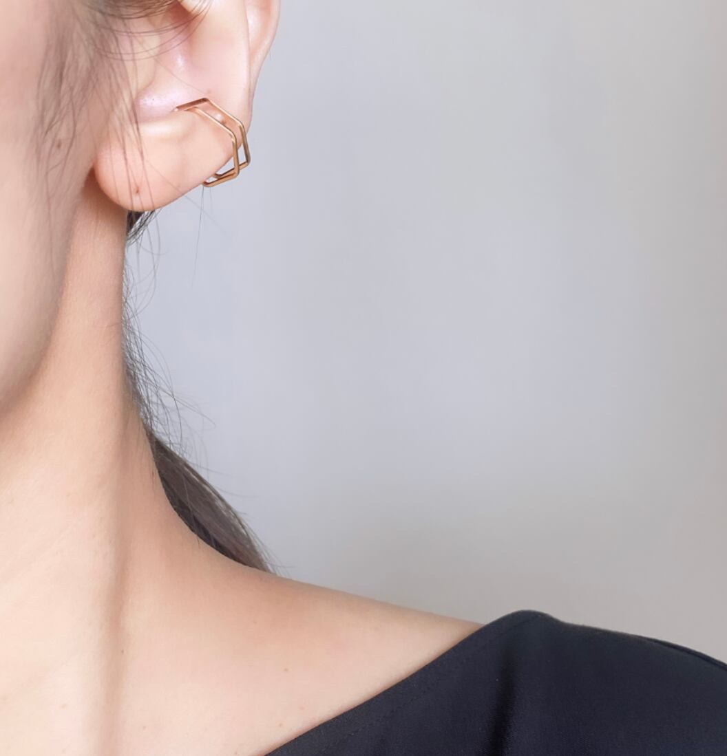 フープのイヤーカフとは異なり、直線と角がシャープでモダンな印象に。