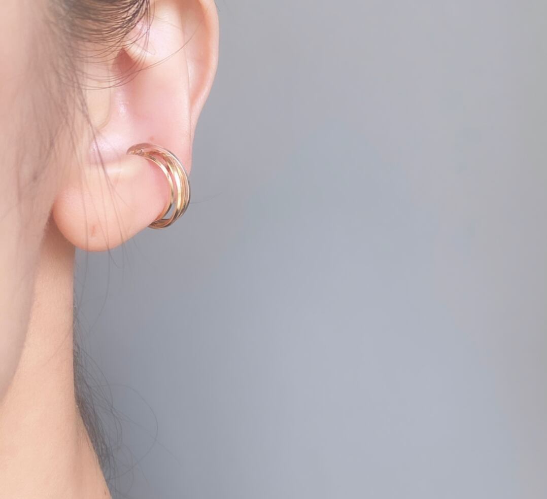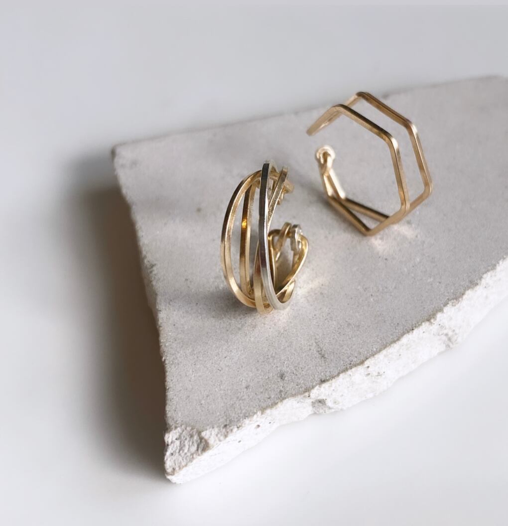 ご好評いただいているゴールドシルバーミックス、バイカラーの4連のようなイヤーカフと、 六角形の2連のイヤーカフの2点セット。単品でそれぞれお買い求めいただくよりお得なセット販売です。