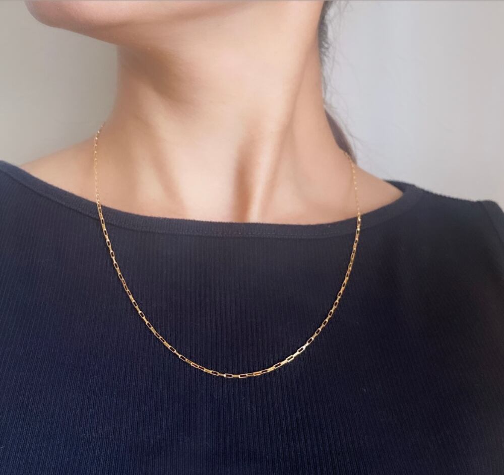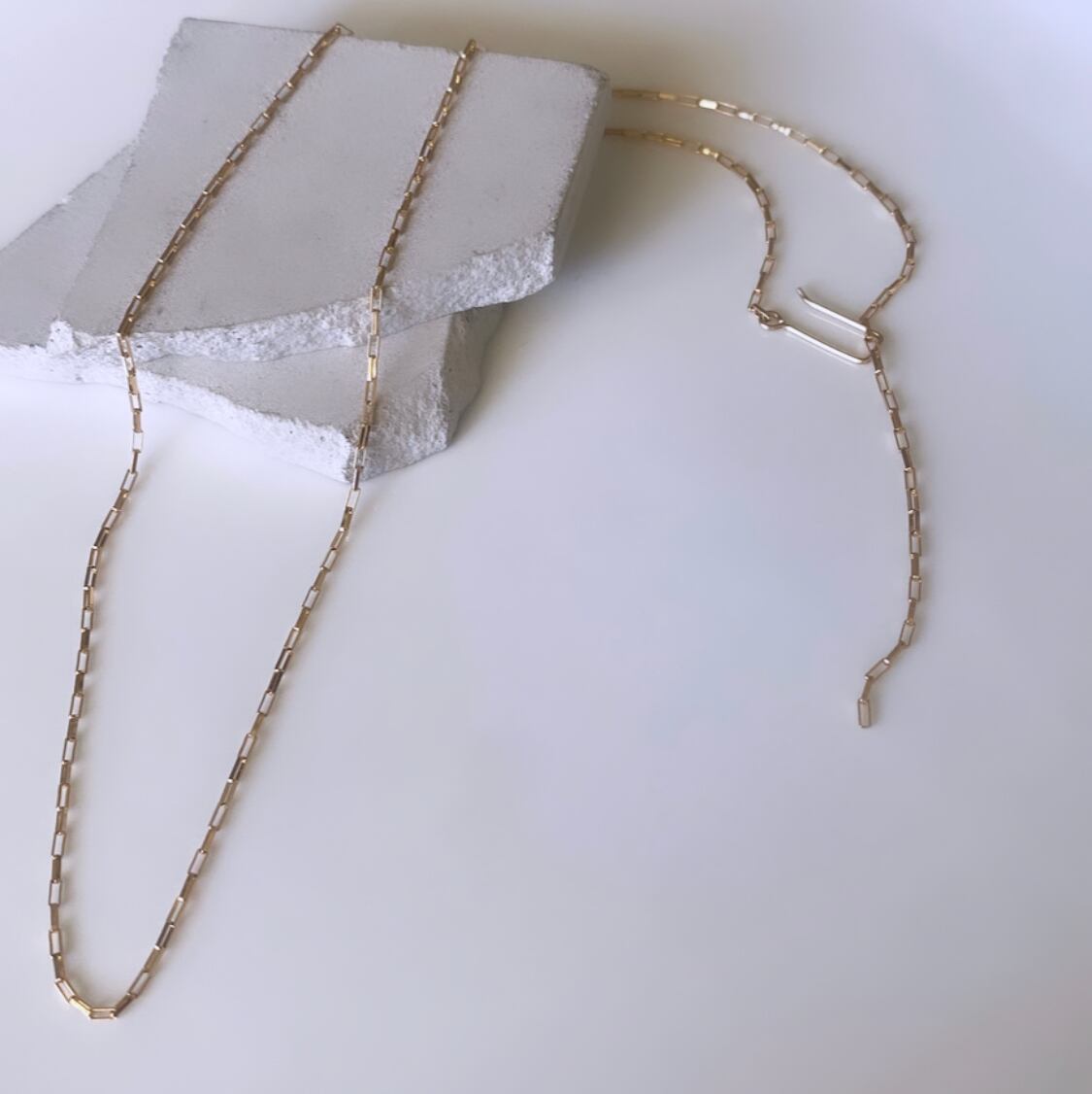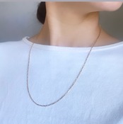シンプルでありながらもちょっと目を惹くボックスチェーンは単体使いで上品にお召し頂けるのはもちろん、他のアクセサリーとのコーディネートもしやすい万能さです。