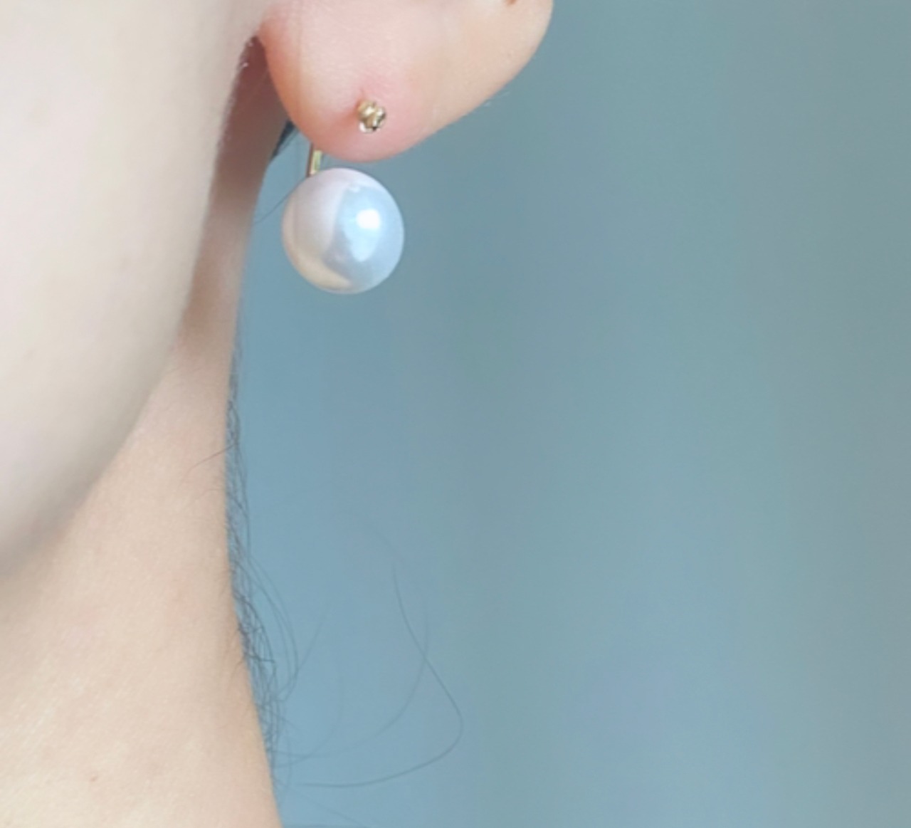 耳たぶにきらりと一点ゴールドがひかり、耳たぶ下に直径10ミリのパールが浮かんでいるようなピアス。