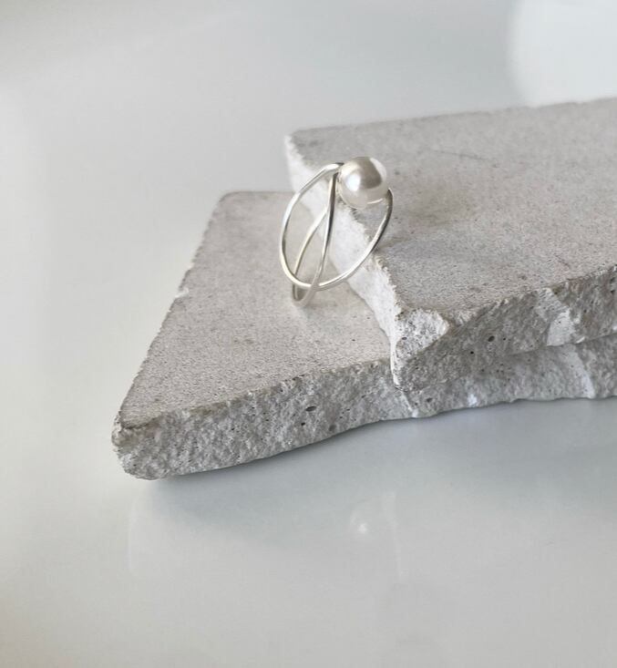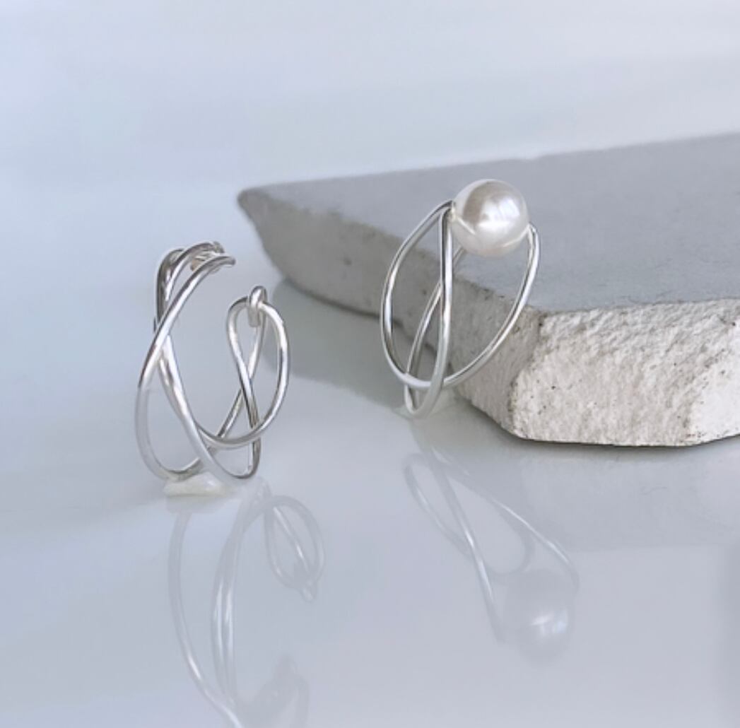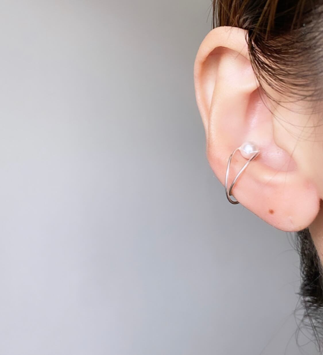 華奢な曲線のラインが滑らかに重なるイヤーカフに5ミリのクリスタルパールを一粒をあしらいました。パールが品よく耳元を彩ってくれます。