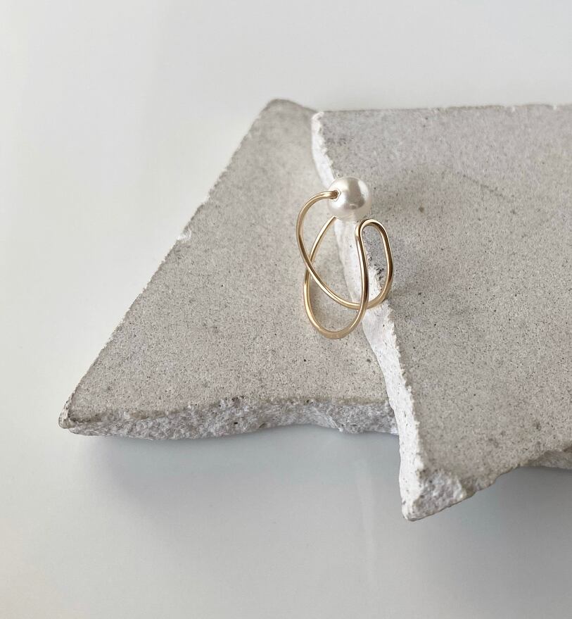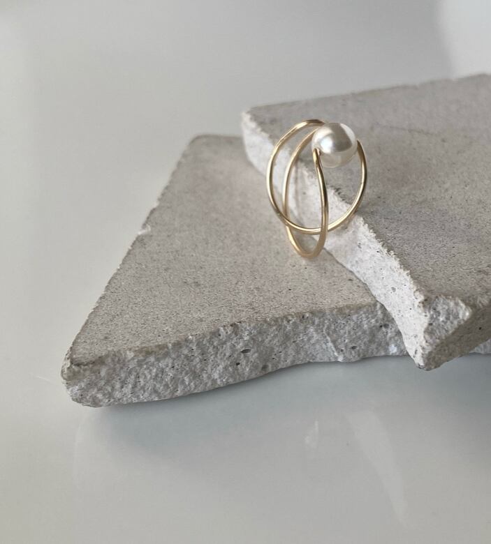 華奢な曲線のラインが滑らかに重なるイヤーカフに5ミリのクリスタルパールを一粒をあしらいました。パールが品よく耳元を彩ってくれます。