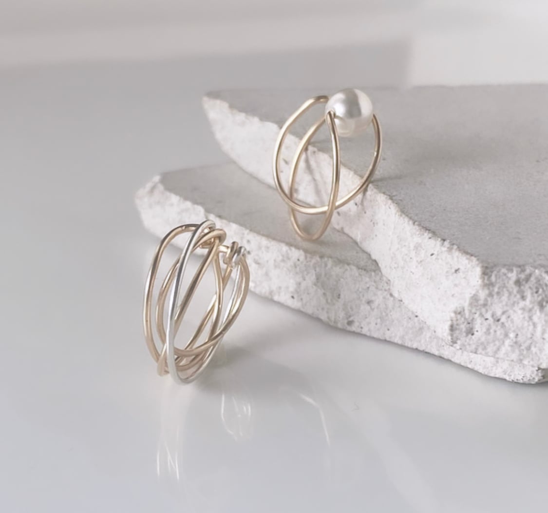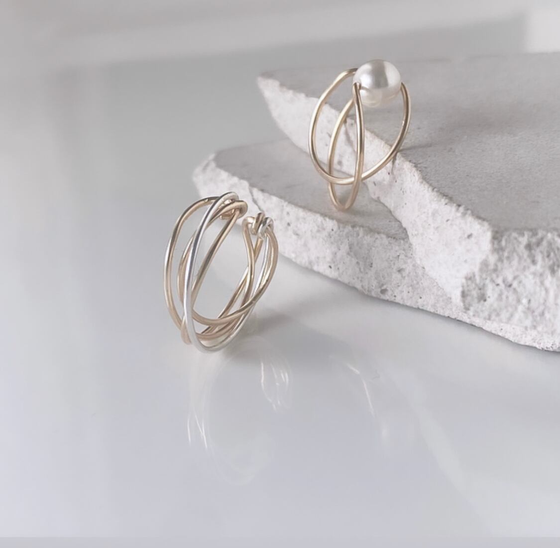 華奢なラインの重なりが魅力のイヤーカフとパールの2wayイヤーカフの新作2点セット。
