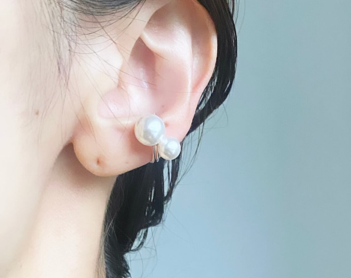 お召しいただくと、2粒のパールが浮かんでいるような、お耳に乗っかっているような軽やかな印象に。