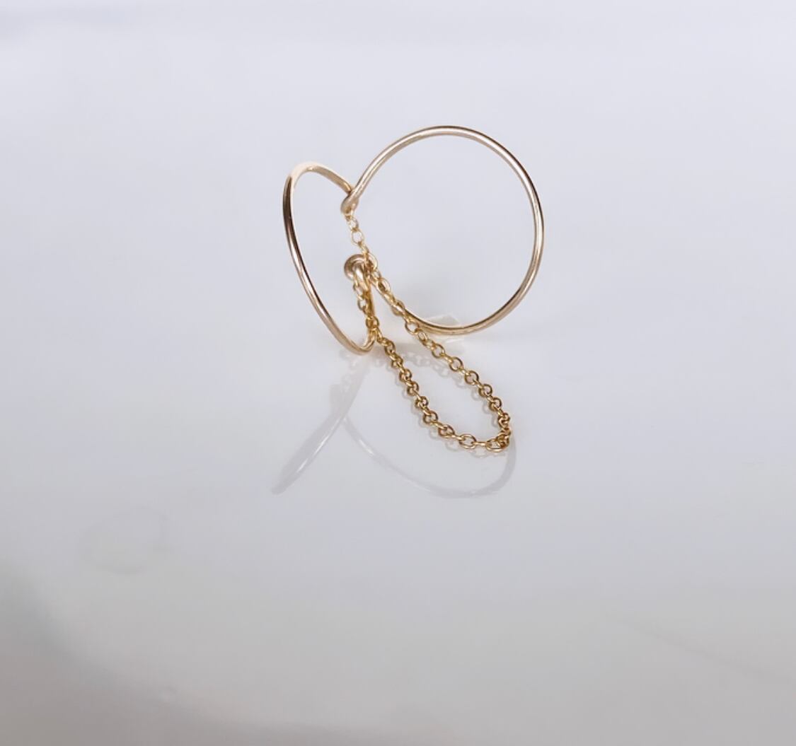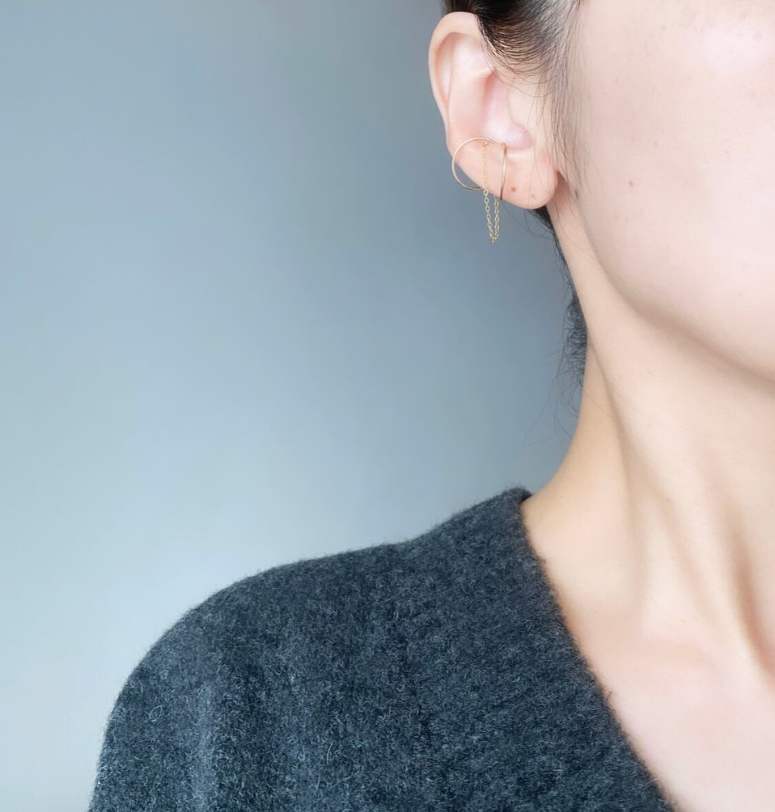 2つの華奢なフープの間から長めのチェーンがさらっと揺れるイヤーカフ。
