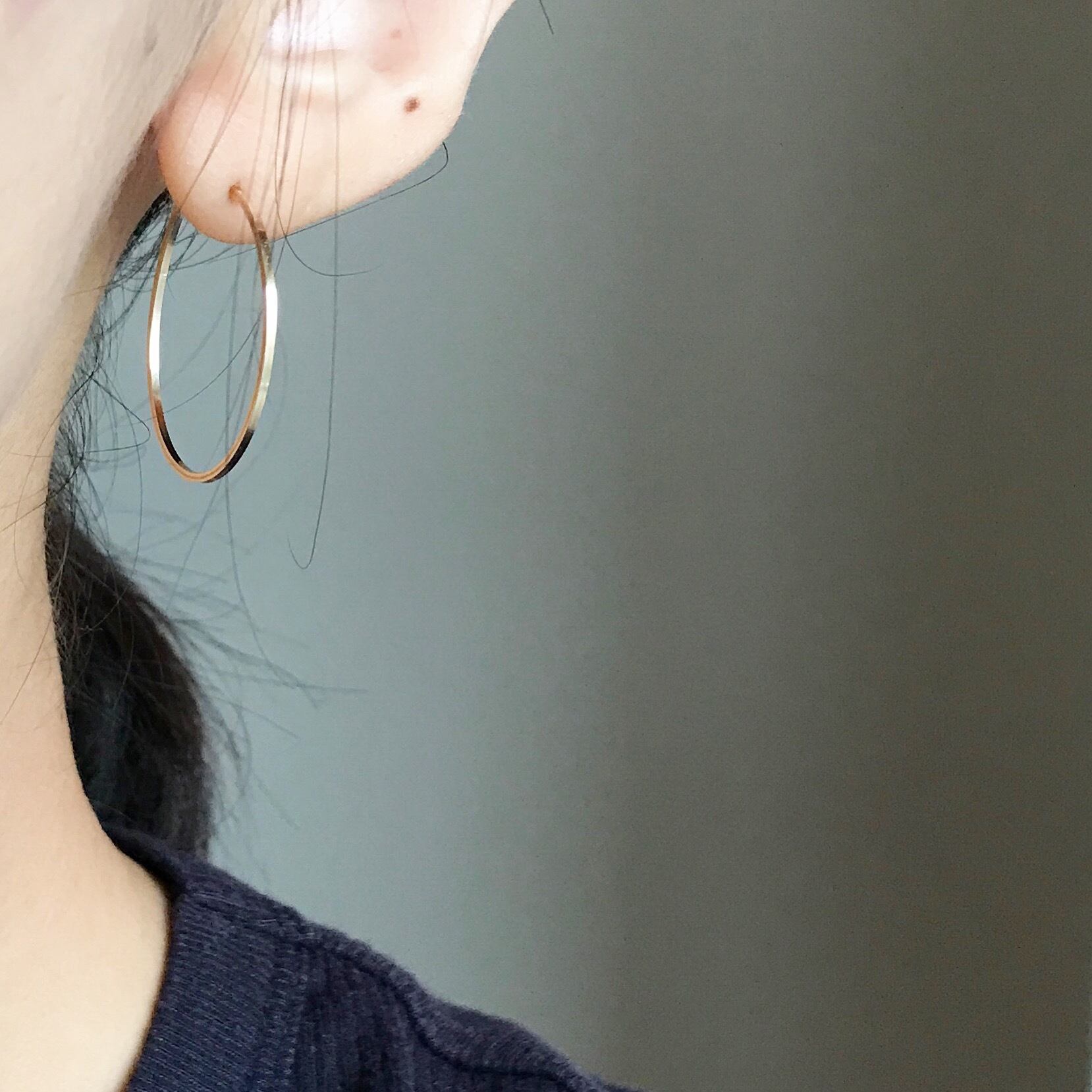 直径約2.5cmの無駄を削ぎ落とした、シンプルなフープピアスです。14kgf(ゴールドフィルド)のスクエアワイヤーを使用しているので、シンプルながらも程よい存在感と輝きです。