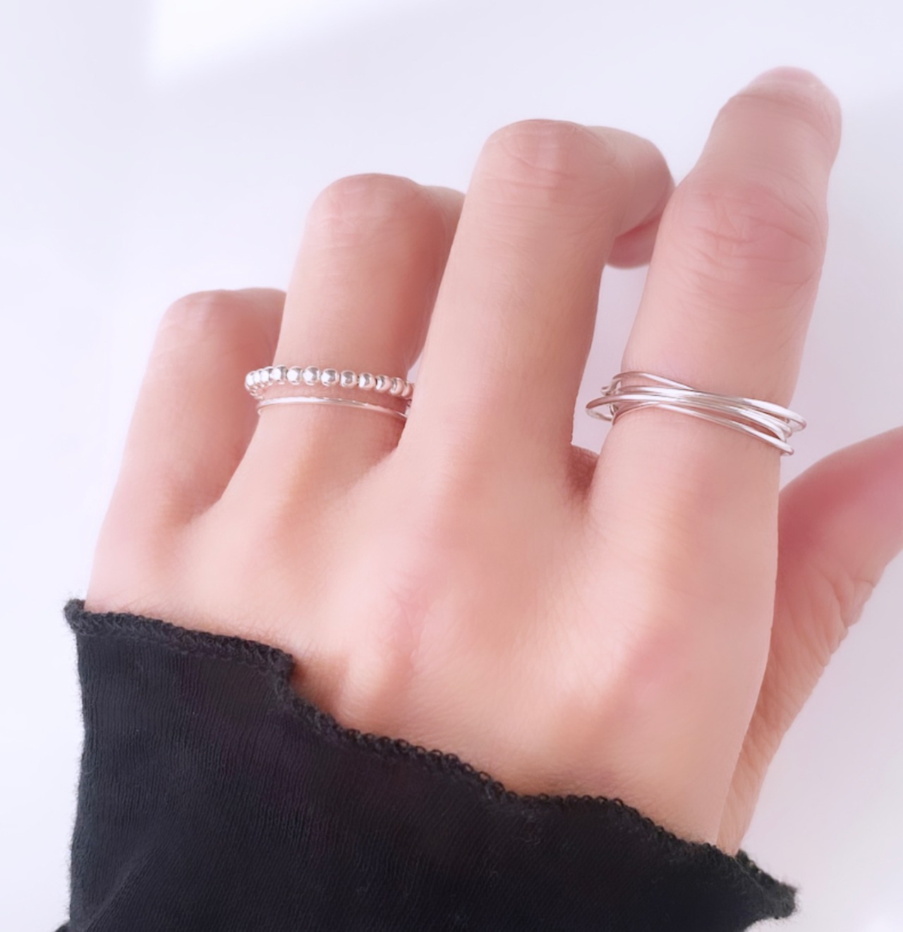 リングの大きさが微妙にそれぞれ異なるので指とリングの間に空間があるところもあり、立体感が魅力の指輪です。