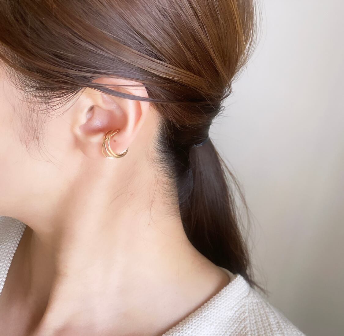 斜めのラインが重なりあった3連の小ぶりなフープピアスとイヤカフ。