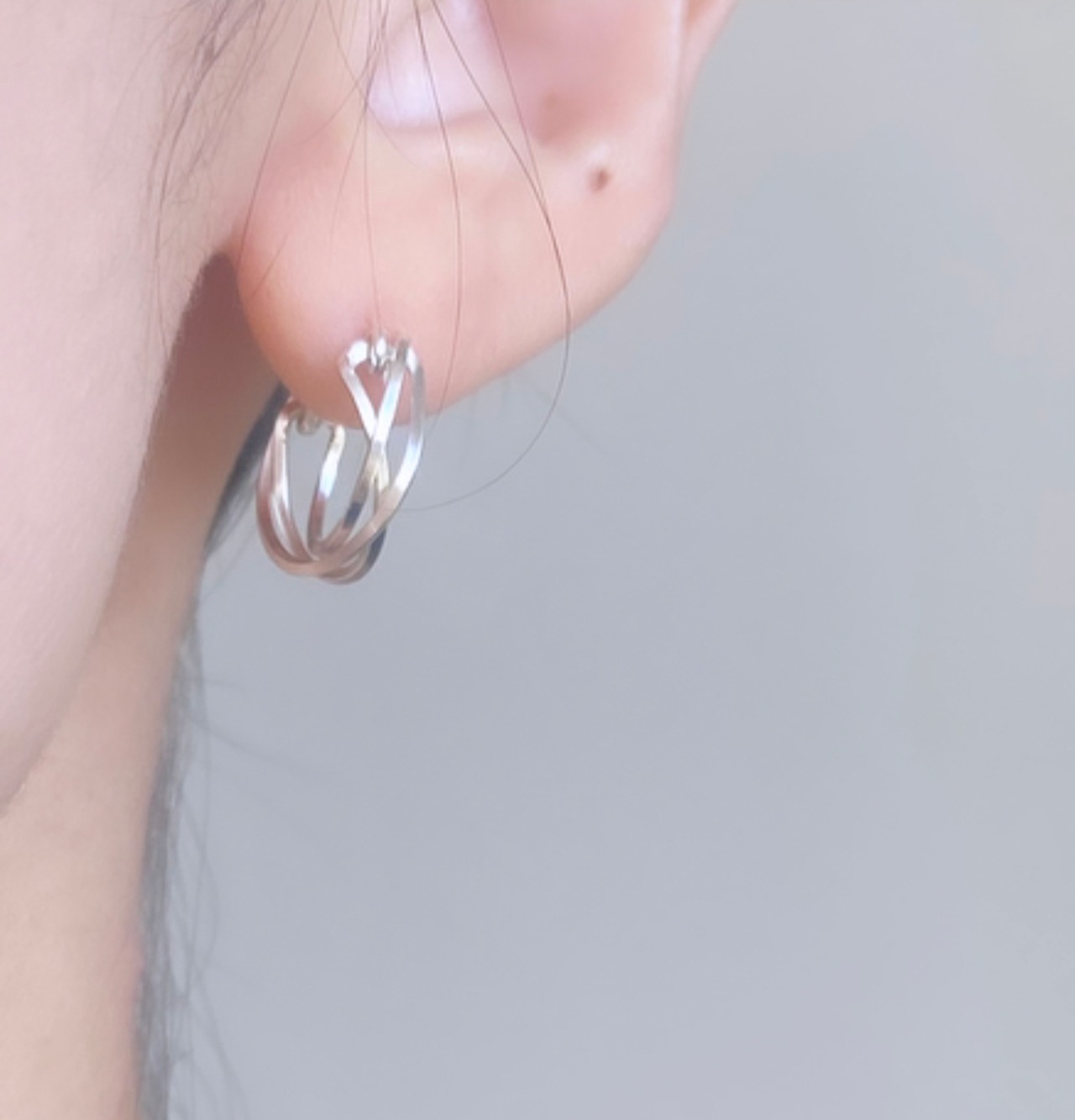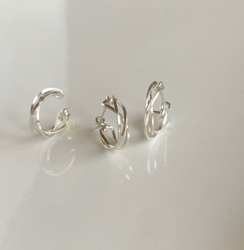 斜めのラインが重なりあった3連の小ぶりなフープピアスとイヤカフ。