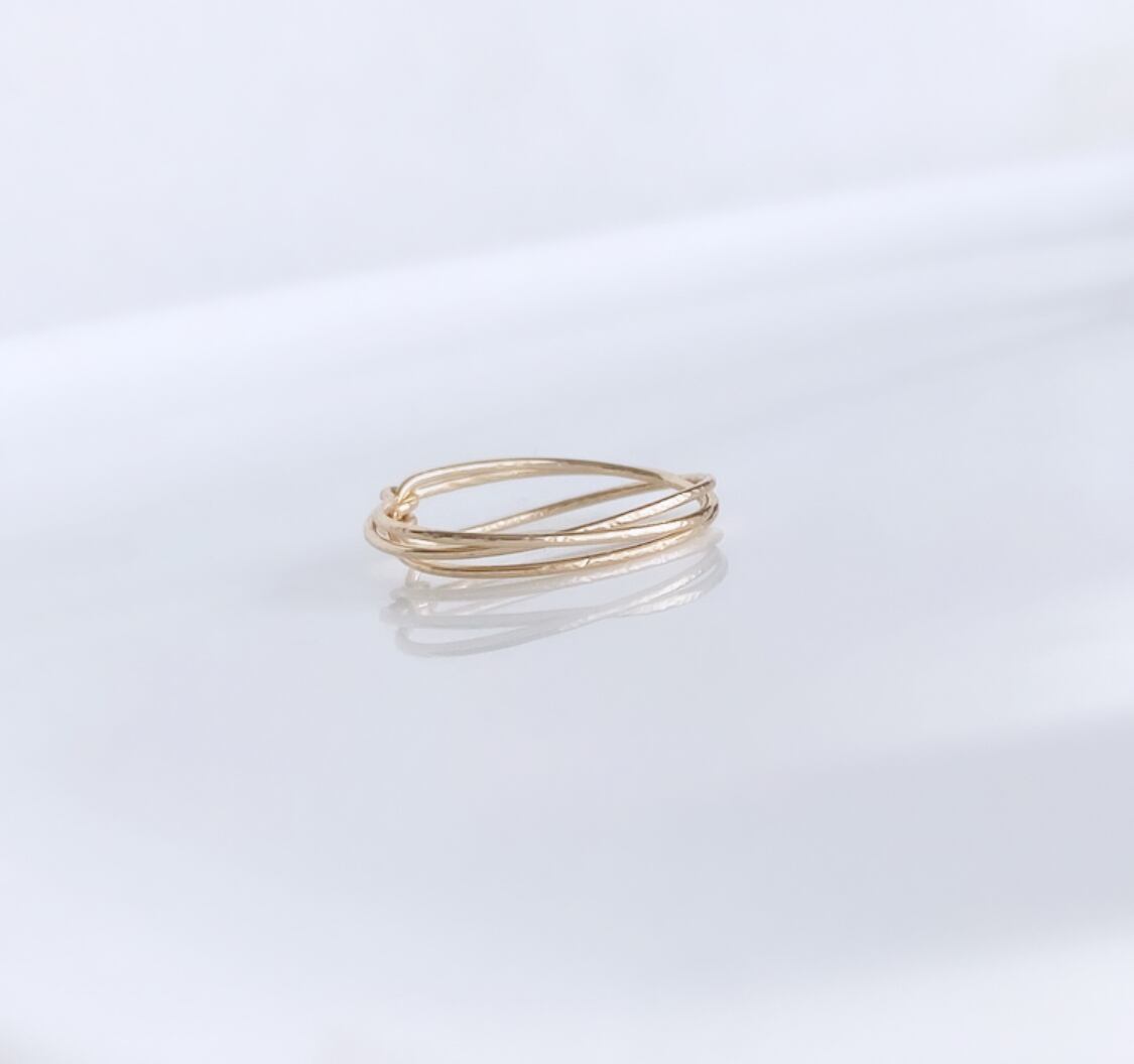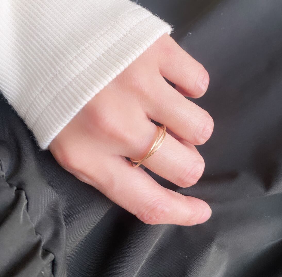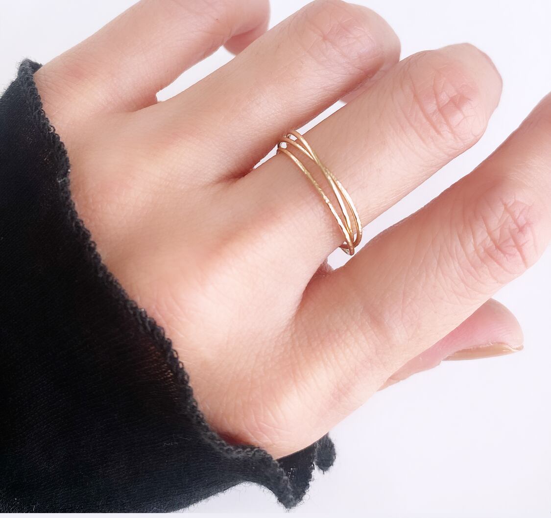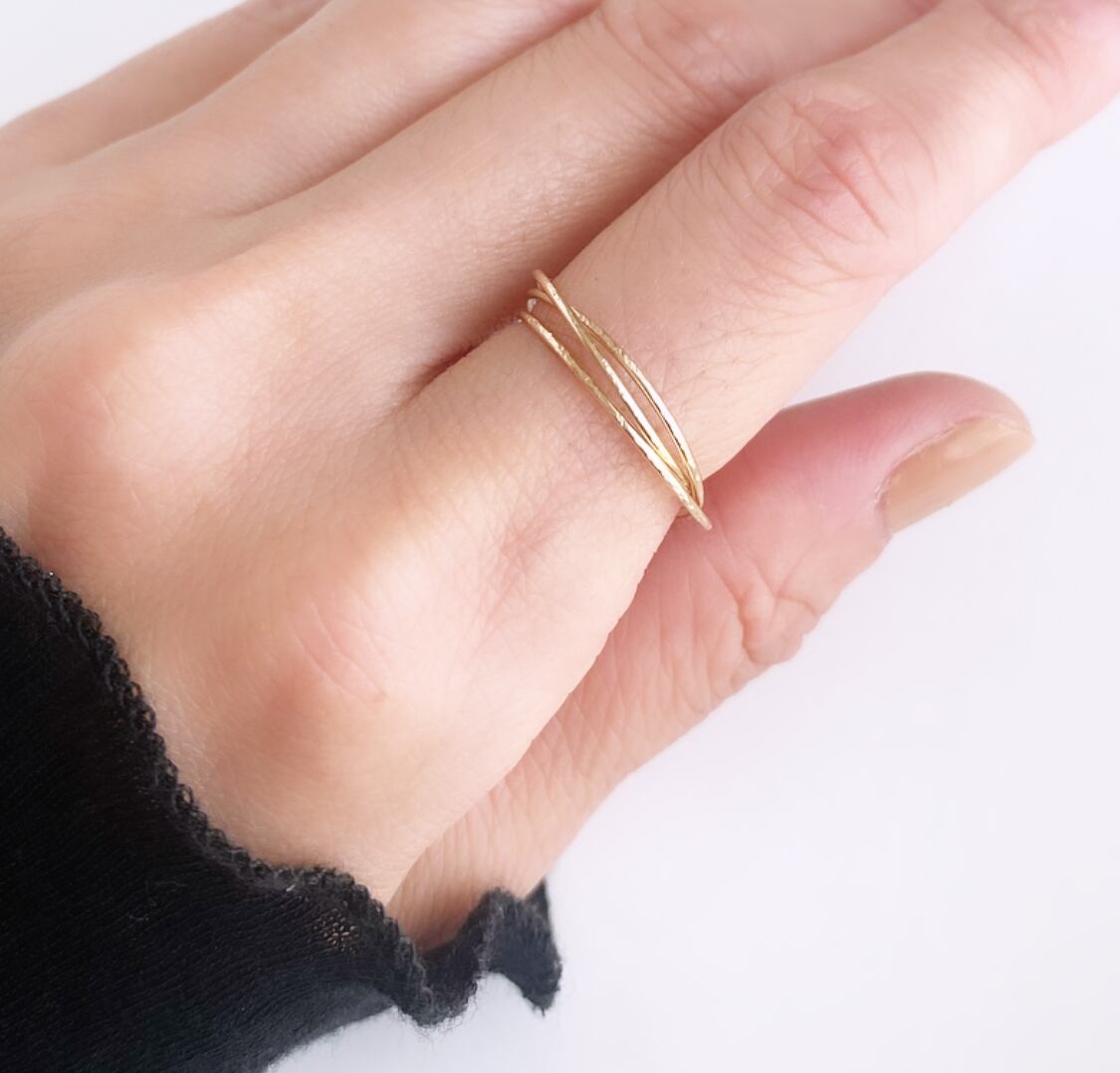 ラインの重なりが美しい、華奢な3連のリング。