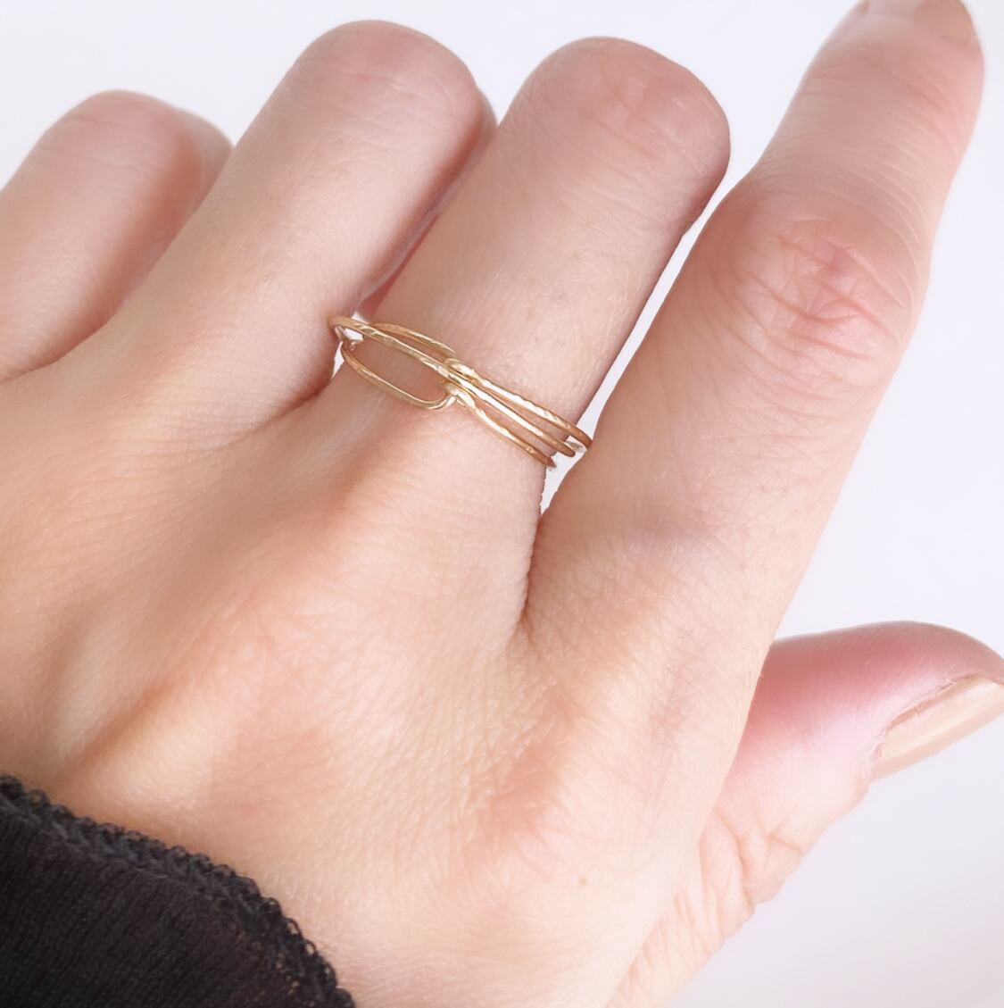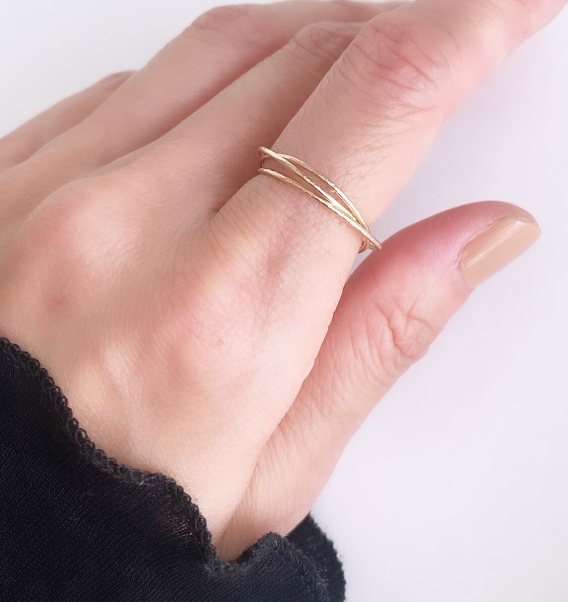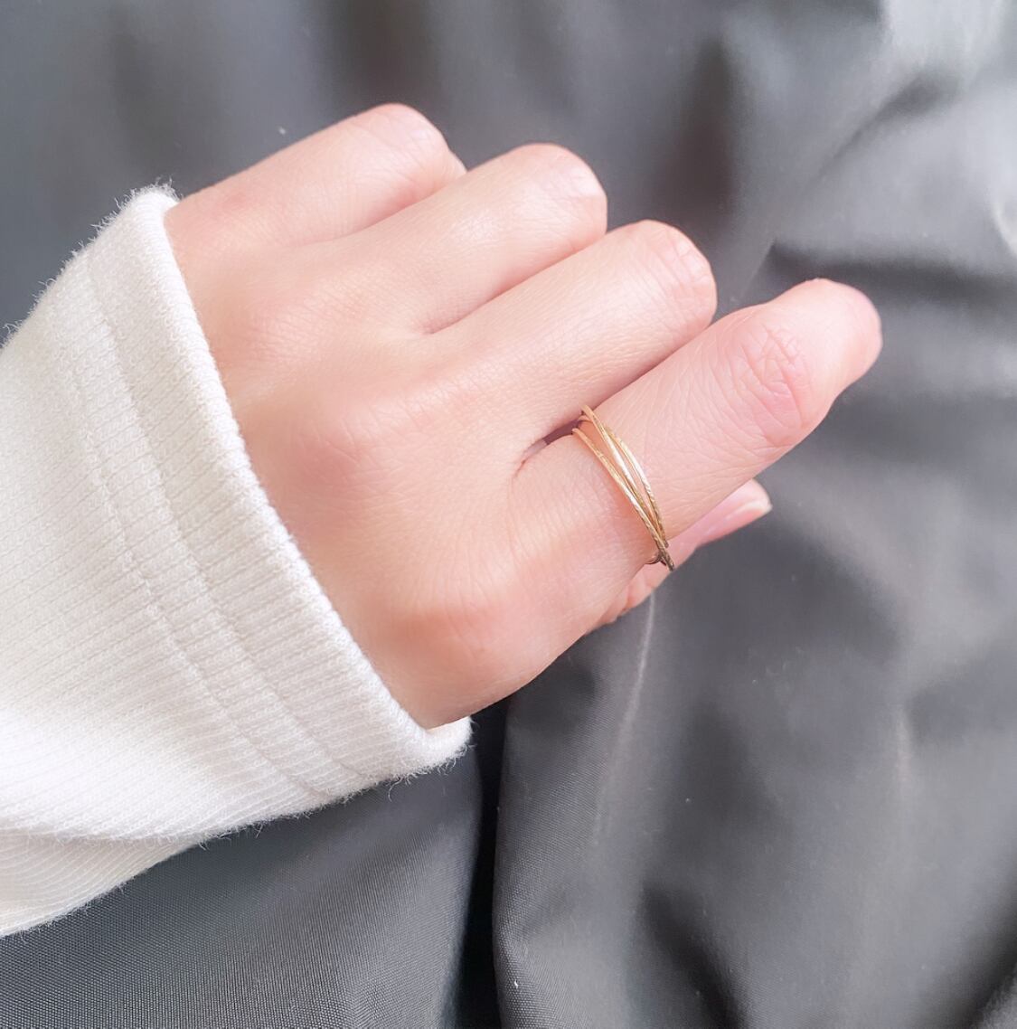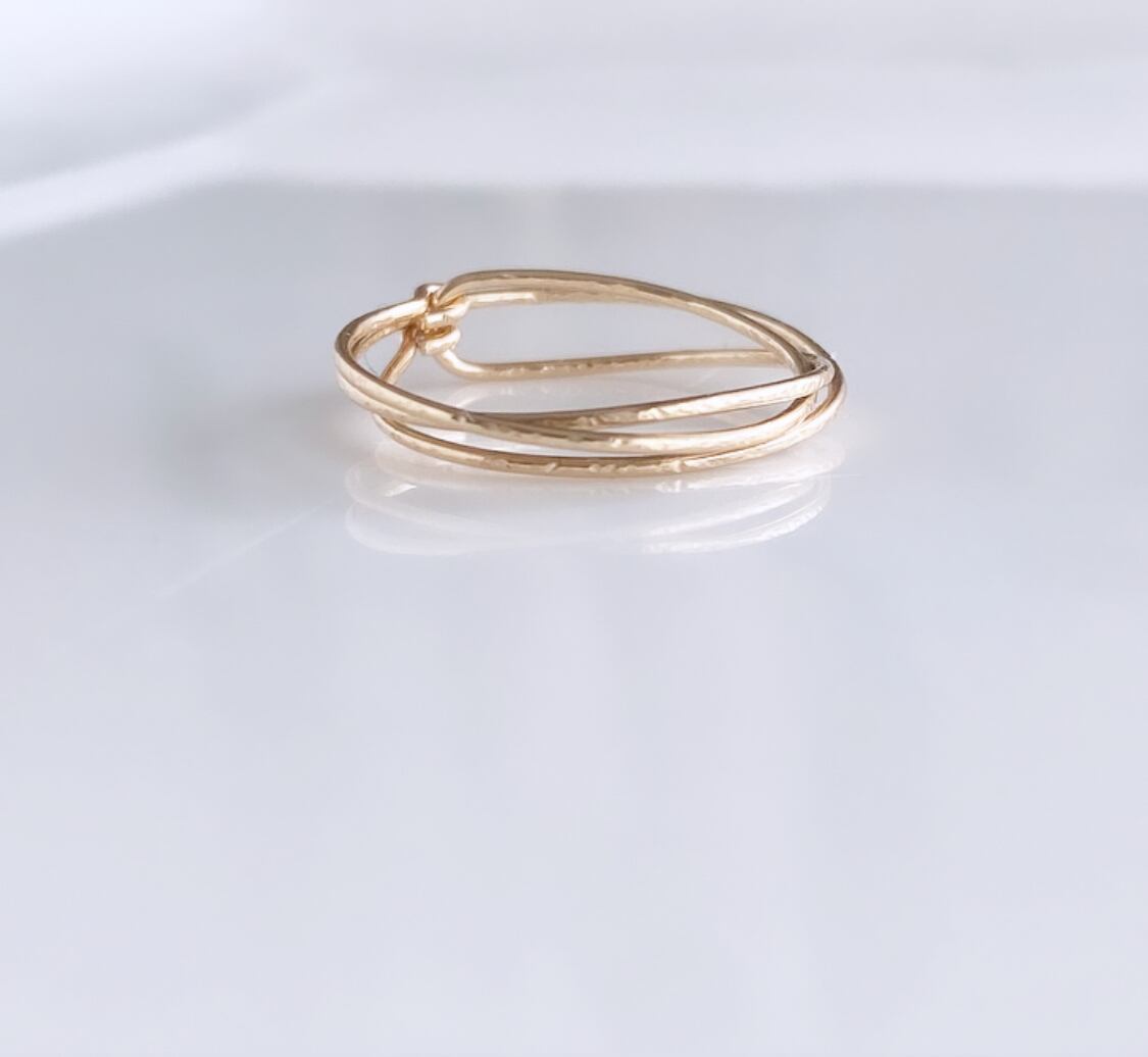 ラインの重なりが美しい、華奢な3連のリング。