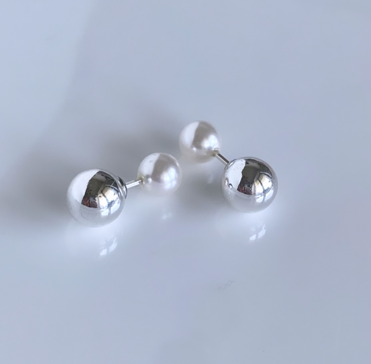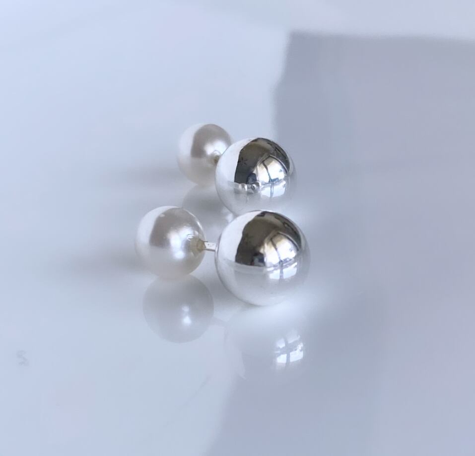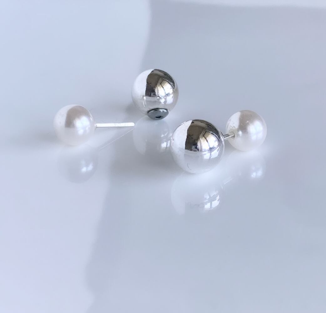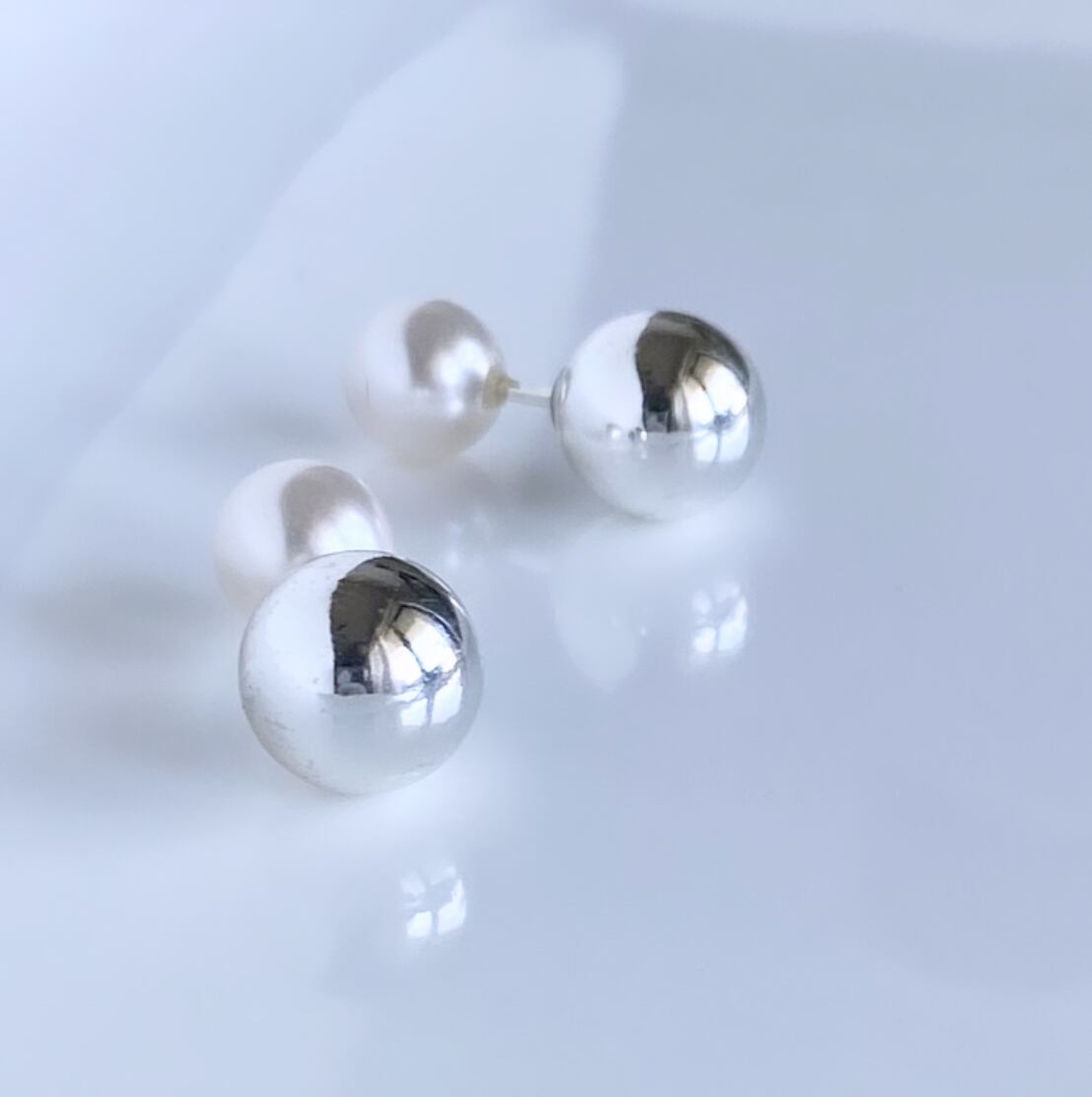 8mmのクリスタルパールと10mmのシルバーボールのリバーシブルピアス。