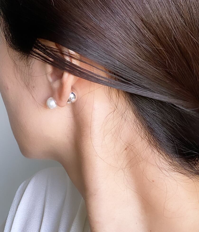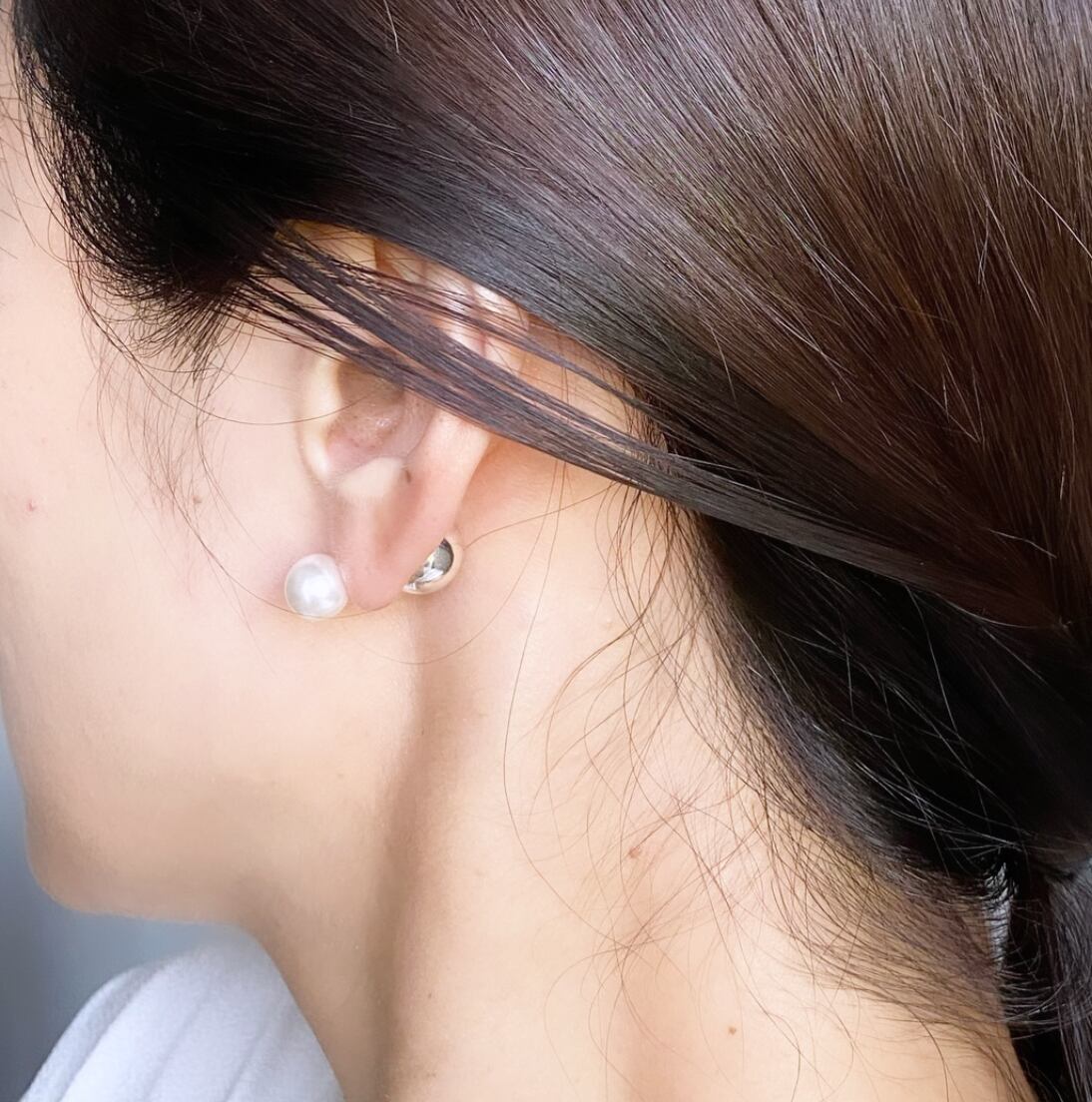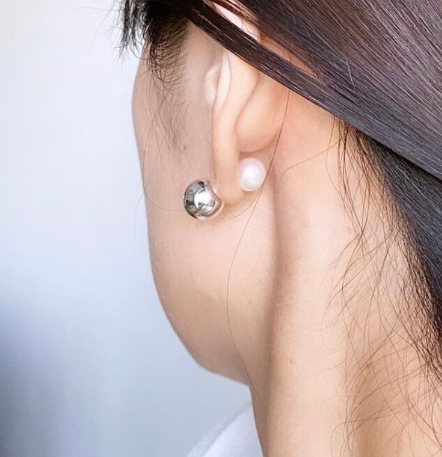 パールピアスをピアスホールの後ろから挿れて頂いてシルバーボールのキャッチが前面に来るようにお召しいただくことで、