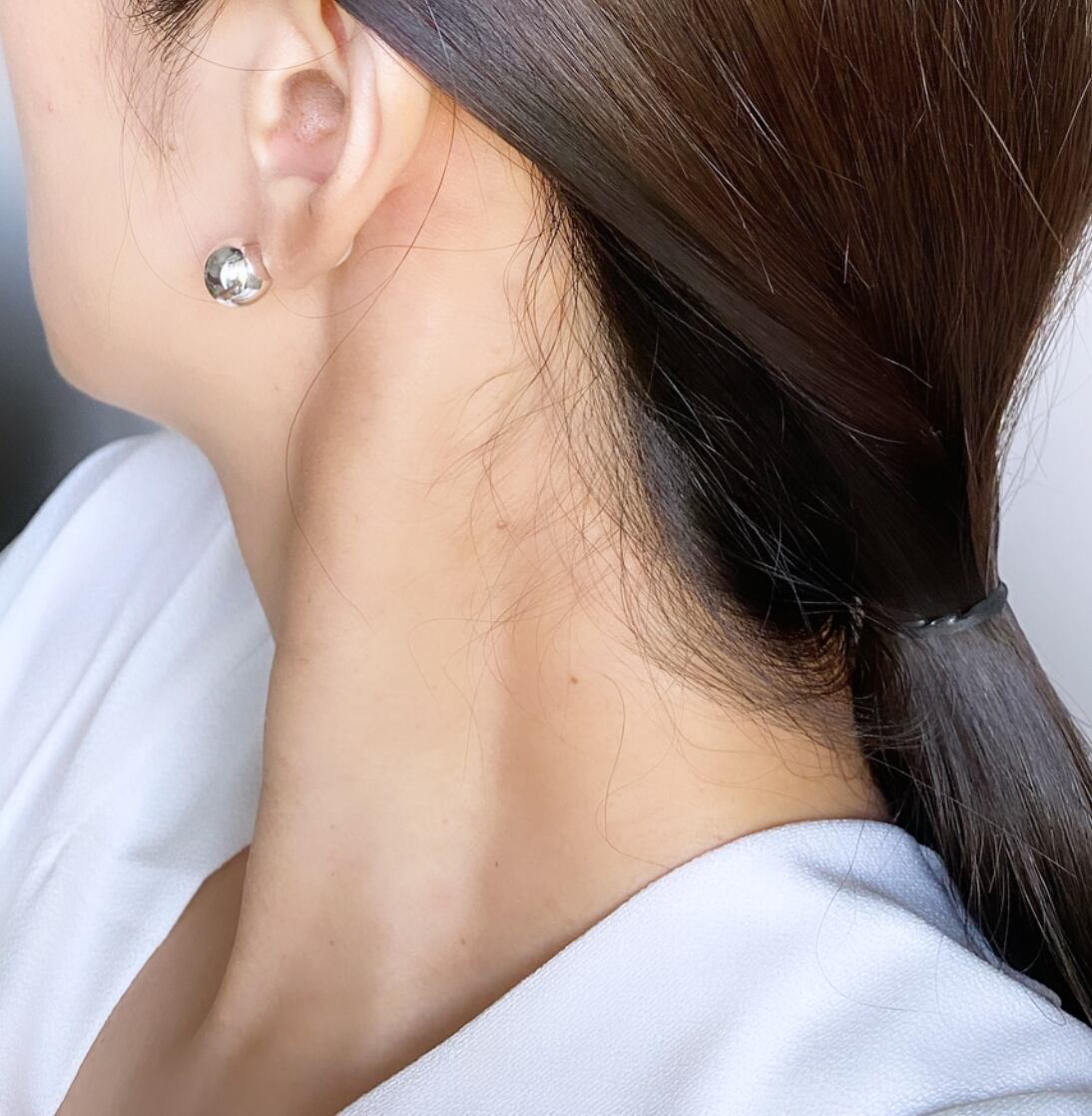 10mmのシルバーカラーのボールピアスはどのようなスタイルにも合わせやすく、お召しいただくだけで洗練された印象に。