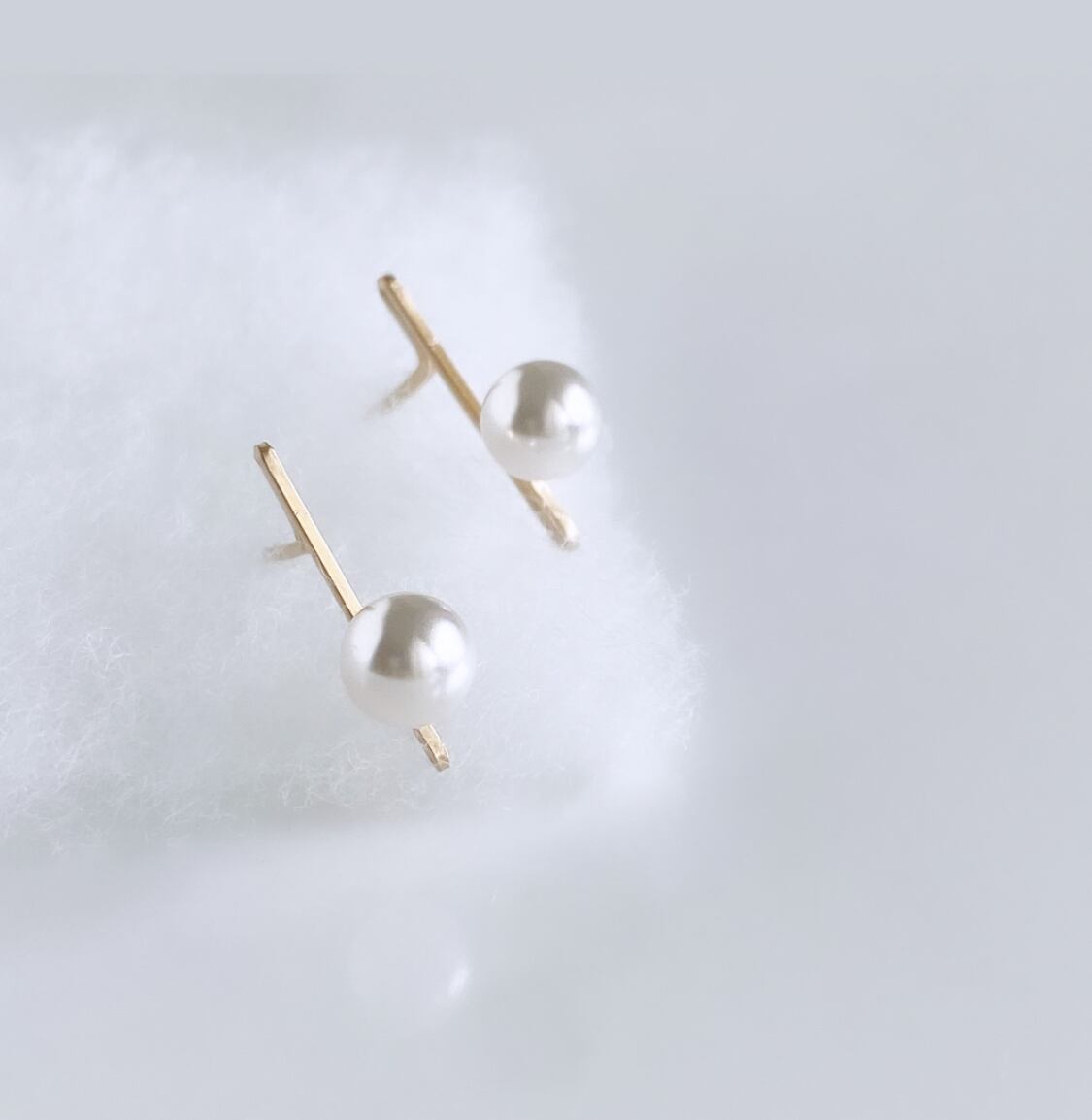 華奢なゴールドのバーにパールが乗っかっているようなスタッドピアス。