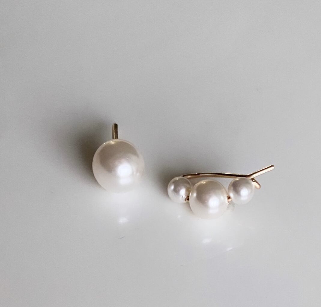 パールと楕円のゴールドフープが2連のようなイヤーカフと、耳たぶにパールが散りばめられたようなアシンメトリーパールのセットです。