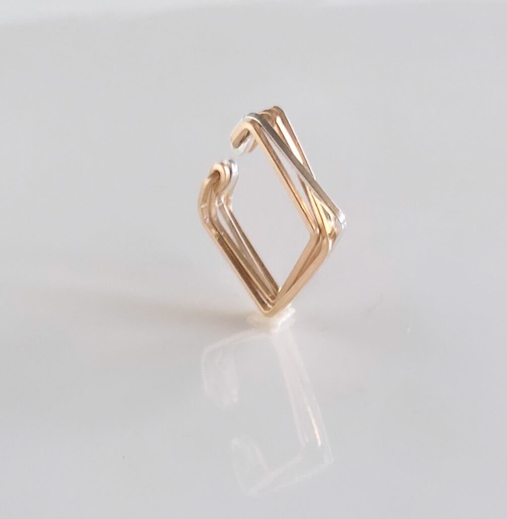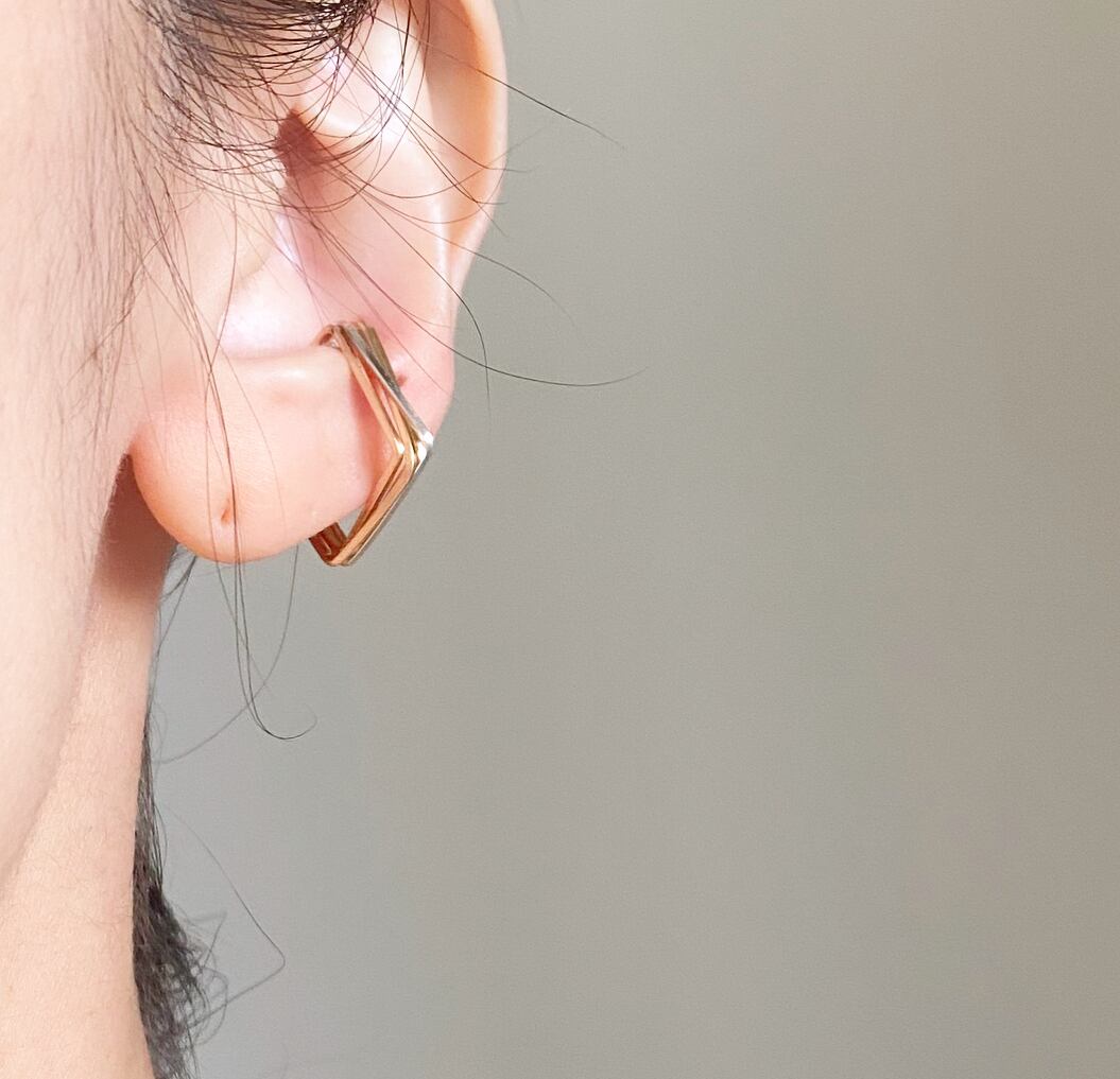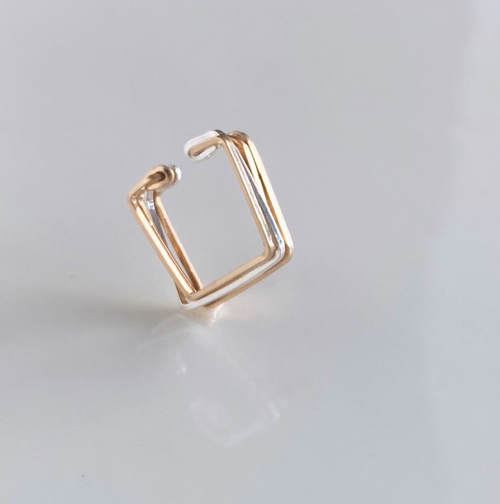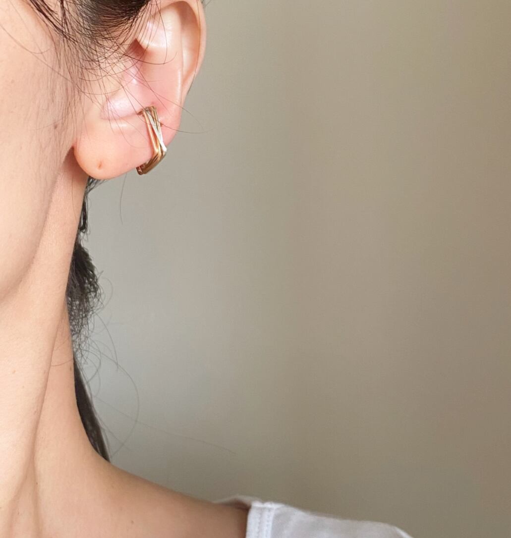 ゴールドとシルバーのラインが重なりあったスクエアの4連イヤーカフ。