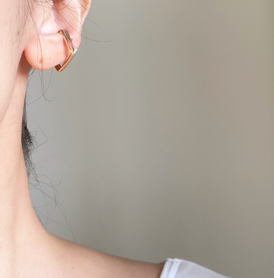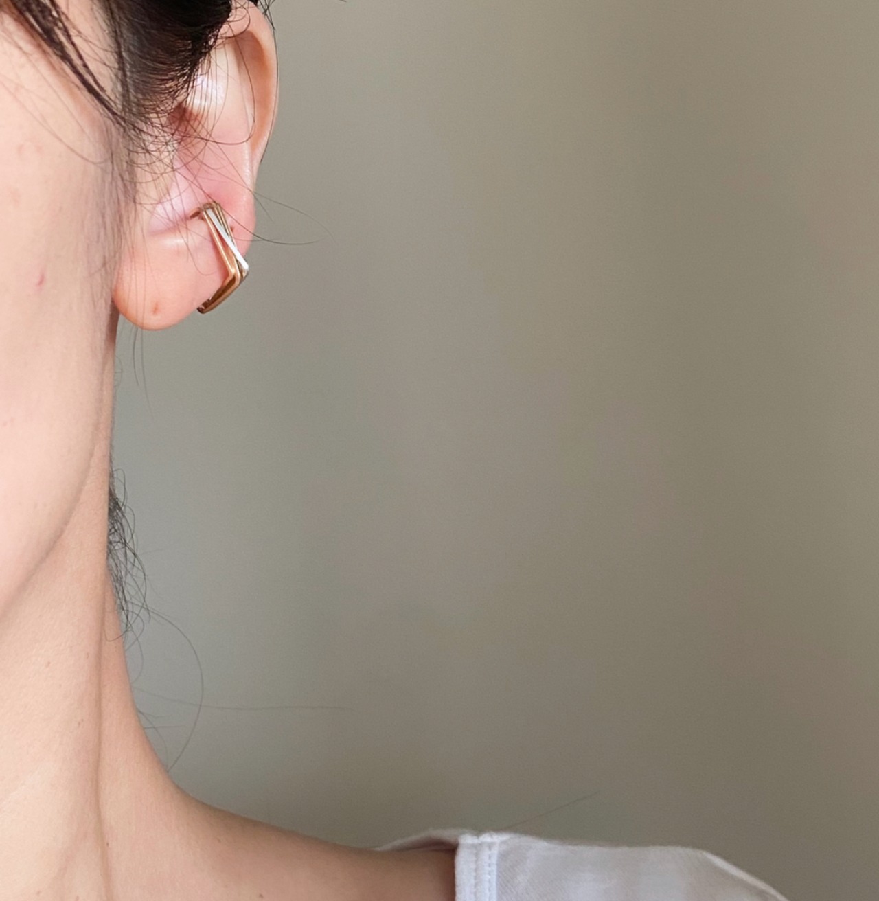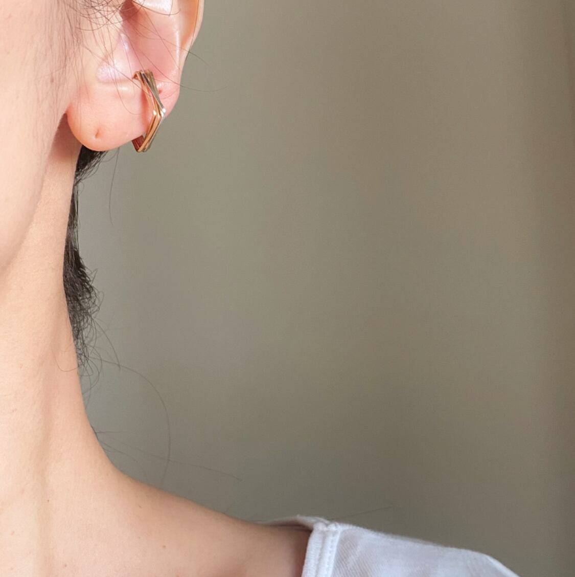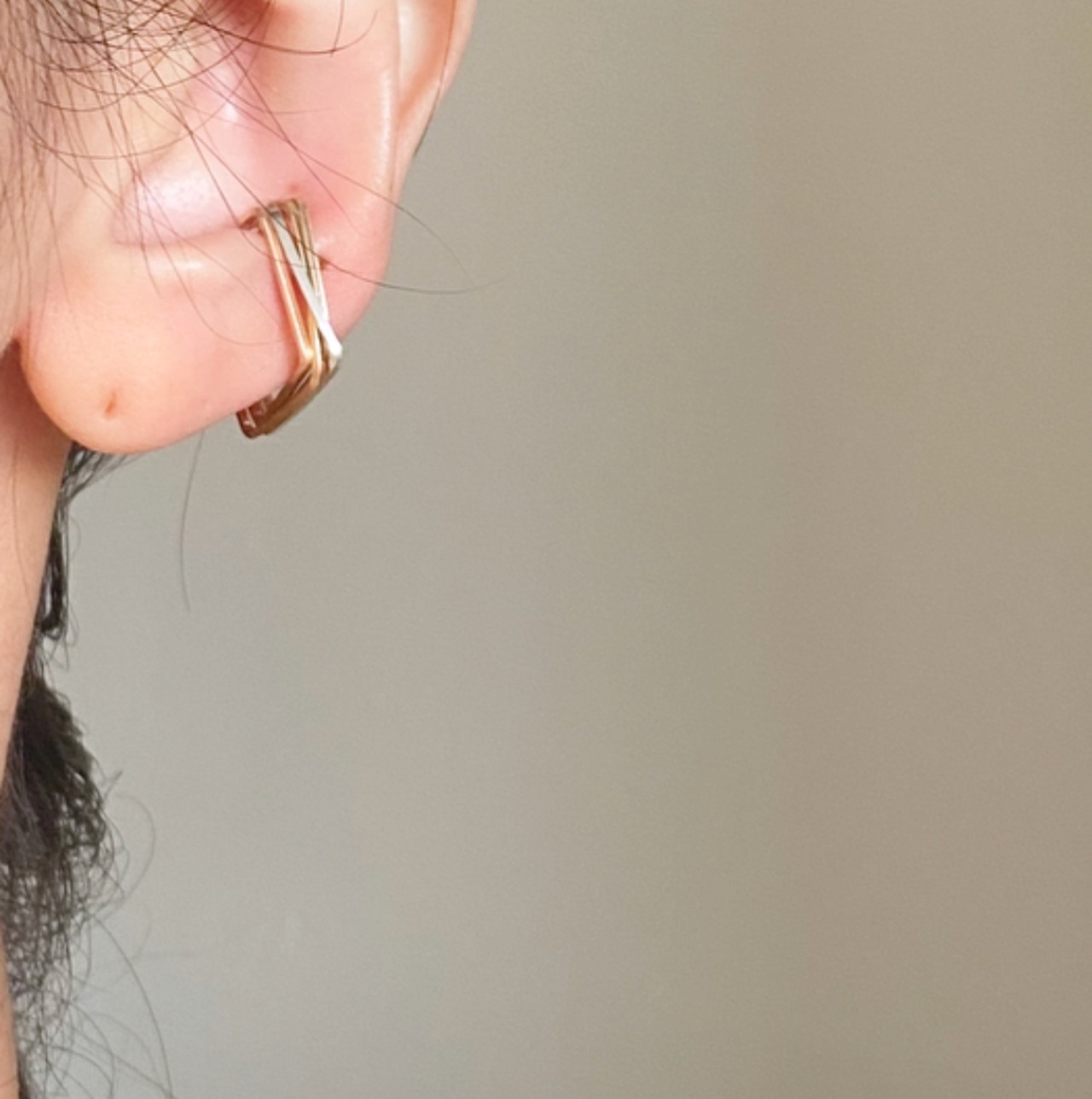 ゴールドとシルバーのラインが重なりあったスクエアの4連イヤーカフ。