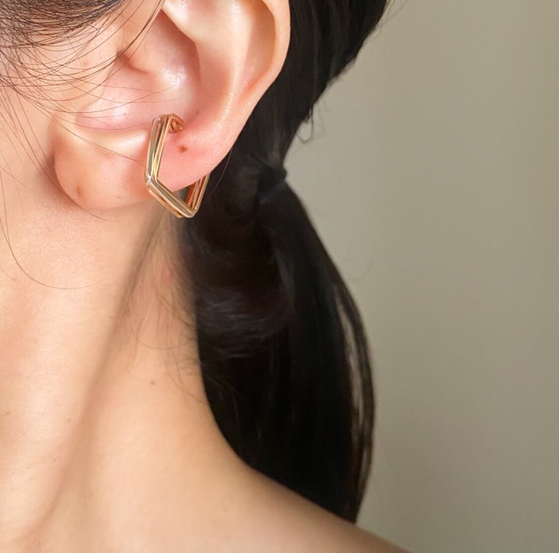 異なったサイズのフープが斜めに重なり、小ぶりながらも耳元にニュアンスを感じさせてくれます。